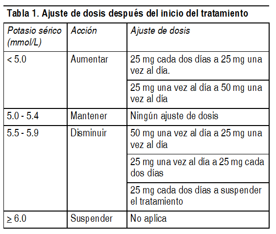 COMPOSICION: Aldactone EP 25 mg: Cada comprimido recubierto contiene: Eplerenona 25 mg. Excipientes: Núcleo: Lactosa Monohidrato, Celulosa Microcristalina, Croscarmelosa Sódica, Hipromelosa, Lauril Sulfato de Sodio, Talco, Estearato de Magnesio, c.s. Recubrimiento: Opadry Yellow (este componente contiene Hipromelosa, Dióxido de Titanio, Polietilenglicol 400, Polisorbato 80, Oxido de Hierro Amarillo y Oxido de Hierro Rojo) c.s. Aldactone EP 50 mg: Cada comprimido recubierto contiene: Eplerenona 50 mg. Excipientes: Núcleo: Lactosa Monohidrato, Celulosa Microcristalina, Croscarmelosa Sódica, Hipromelosa, Lauril Sulfato de Sodio, Talco, Estearato de Magnesio, c.s. Recubrimiento: Opadry Yellow (este componente contiene Hipromelosa, Dióxido de Titanio, Polietilenglicol 400, Polisorbato 80, Oxido de Hierro Amarillo y Oxido de Hierro Rojo) c.s. ACCION: Antagonista específico de la aldosterona. Grupo farmacoterapéutico: Antagonistas de la aldosterona. Código ATC: C03DA04. INDICACIONES: Insuficiencia cardíaca congestiva posterior a infarto de miocardio: Aldactone EP está indicado como tratamiento de adición a la terapia estándar (incluyendo ß-bloqueantes) para reducir el riesgo de mortalidad y morbilidad cardiovascular en pacientes estables con fracción de eyección del ventrículo izquierdo ([FEVI] ≤ 40%) y evidencia clínica de insuficiencia cardíaca después de un infarto de miocardio reciente. Pacientes con insuficiencia cardíaca crónica (clasificación II de la NYHA): Como tratamiento de adición a la terapia estandar óptima para reducir el riesgo de mortalidad y morbilidad cardiovascular en pacientes adultos con insuficiencia cardíaca crónica (clasificación II de la NYHA) y disfunción sistólica ventricular izquierda (DSVI ≥30%). Hipertensión: Aldactone EP está indicado para el tratamiento de la hipertensión. En estos pacientes, Aldactone EP puede ser utilizado solo o en combinación con otros agentes antihipertensivos. DOSIS: Se dispone de las concentraciones de 25 y 50 mg para el ajuste individual de la dosis. La pauta posológica es de 50 mg diarios. Insuficiencia cardíaca congestiva posterior a infarto de miocardio: La dosis de mantenimiento recomendada de eplerenona es de 50 mg, 1 vez al día. El tratamiento debe iniciarse con 25 mg, 1 vez al día, titulada hasta la dosis óptima de 50 mg, 1 vez al día, preferiblemente en 4 semanas, teniendo presente el nivel de potasio sérico (ver Tabla 1). En general, la terapia con eplerenona debe iniciarse en los 3-14 días posteriores a un infarto agudo de miocardio. Pacientes con insuficiencia cardíaca crónica (clasificación II de la NYHA): Para los pacientes con insuficiencia cardíaca crónica (clasificación II de la NYHA), el tratamiento debe iniciarse con una dosis de 25 mg 1 vez al día y titulada hasta la dosis óptima de 50 mg 1 vez al día, preferiblemente en 4 semanas, teniendo presente el nivel de potasio sérico (ver Tabla 1). No debe iniciarse el tratamiento en aquellos pacientes con niveles de potasio sérico > 5.0 mmol/l. Tras el inicio, se debe ajustar la dosis basándose en el nivel de potasio sérico como se muestra en la Tabla 1. Ver Tabla Después de suspender el tratamiento con eplerenona debido a un potasio sérico ≥ 6.0 mmol/l, se puede reiniciar el tratamiento con una dosis de 25 mg, cada 2 días, siempre que los niveles de potasio hayan descendido por debajo de 5.0 mmol/l. Hipertensión: La dosis de inicio recomendada de Aldactone EP es 50 mg, 1 vez al día. El efecto terapéutico completo se obtiene dentro de las 4 semanas. Aquellos pacientes que presenten una respuesta de presión arterial inadecuada a la dosis de 50 mg diarios, la dosis de Aldactone EP debe incrementarse a 50 mg 2 veces al día. No se recomiendan dosis mayores a 100 mg de Aldactone EP dado que no resultan en un efecto mayor sobre la presión arterial y, a su vez, están asociadas con un mayor riesgo de hipercalemia. Se debe medir el potasio sérico antes de iniciar el tratamiento con eplerenona, en la primera semana y al mes del inicio del tratamiento o del ajuste de dosis. Posteriormente, el potasio sérico se debe valorar periódicamente según necesidad. Niños y adolescentes: En un estudio realizado en 304 pacientes pediátricos hipertensos (de 4 a 17 años) tratados durante 10 semanas con un máximo de 100 mg de eplerenona por día, dosis que produjeron exposición similar a la que se estudió en adultos, la eplerenona no redujo la presión arterial efectivamente. En este estudio y en un estudio de seguridad realizado en 149 pacientes durante 1 año, la incidencia de los eventos adversos reportados fue similar a la reportada en adultos. La eplerenona no se ha estudiado en pacientes hipertensos menores a 4 años, dado que el estudio en pacientes pediátricos de mayor edad no demostró eficacia. La eplerenona no ha sido estudiada en pacientes pediátricos con insuficiencia cardíaca. Ancianos: Debido al deterioro de la función renal relacionado con la edad, el riesgo de hipercalemia está aumentado en los ancianos. Se recomienda el monitoreo periódico del potasio sérico. Insuficiencia renal: No se requiere ningún ajuste de la dosis inicial en los pacientes con insuficiencia renal leve. Se recomienda el monitoreo periódico del potasio sérico y dosis ajustadas según la Tabla 1. Los pacientes con insuficiencia renal moderada [CrCl (clearance de creatinina) de 30 a 60 ml/min] deben comenzar con 25 mg en días alternos, y la dosis se debe ajustar según el nivel de potasio (ver Tabla 1). Se recomienda el monitoreo periódico del potasio sérico. No existe experiencia en pacientes con CrCl <50 ml/min con insuficiencia cardíaca posterior a un infarto de miocardio. Eplerenona se debe utilizar con precaución en estos pacientes. No se han estudiado dosis superiores a 25 mg diarios en pacientes con CrCl < 50 ml/min. Contraindicado en pacientes con insuficiencia renal severa (CrCl < 30 ml/min). Eplerenona no es dial