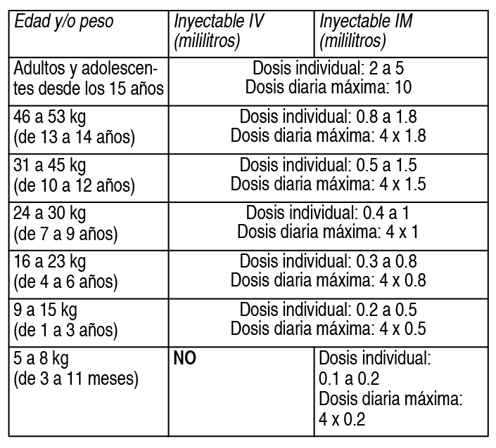 COMPOSICION: Analgina Comprimidos: Cada comprimido contiene: Dipirona 500 mg. Analgina Gotas: Cada 100 ml de solución contiene: Dipirona 50 g. Analgina Inyectable 1 g: Cada ampolla de 2 ml contiene: Dipirona 1 g. Analgina Inyectable 2.5 g: Cada ampolla de 5 ml contiene: Dipirona 2.5 g. Analgina Jarabe: Cada 100 ml de jarabe contiene: Dipirona 5 g. ACCION: Analgésico. Antipirético. Espasmolítico. INDICACIONES: Fiebre y dolor severo o resistente. DOSIS: Este medicamento se administrara según indicación médica. Las dosis recomendadas son las siguientes: Analgina Comprimidos: para adultos y adolescentes (mayores de 15 años) de 1 a 2 comprimidos por día. Si fuese necesario la dosis podrá aumentarse a 4 comprimidos en un período de 24 horas. Analgina Gotas: Adultos y adolescentes mayores de 15 años: 30-60 gotas. De 12 a 14 años: 23 a 46 gotas. De 8 a 11 años: 15 a 30 gotas. De 5 a 7 años: 11 a 22 gotas. De 3 a 4 años: 8 a 18 gotas. De 2 años: 6 a 12 gotas. De 1 año: 5 a 11 gotas. De 6 a 11 meses: 4 a 9 gotas. De 3 a 5 meses: 3 a 5 gotas. Si fuese necesario se incrementará hasta 4 dosis/día. Analgina Inyectable: En principio la dosificación y la vía de administración dependen del efecto analgésico buscado y de la condición del paciente. En muchos casos la administración oral es suficiente para lograr analgesia satisfactoria. La vía parenteral está reservada para aquellos estados dolorosos agudos graves en los cuales la administración oral no es posible. Se recomienda la vía intravenosa o intramuscular cuando se requiere un rápido inicio del efecto analgésico o cuando no está indicada la administración oral. Cuando se selecciona la vía de administración se debe tener en cuenta que la administración parenteral está asociada con riesgo más alto de reacciones anafilácticas o anafilactoides. Si se considera la administración parenteral en infantes de entre 3 y 11 meses, tener en cuenta que dipirona en este rango de edad se debe inyectar únicamente por vía intramuscular. Es esperable que los efectos analgésico y antipirético se presentes entre los 30 y 60 minutos posteriores a la administración para todas las formas farmacéuticas. Generalmente persisten durante aproximadamente 4 horas. Si el efecto de esta dosis individual es insuficiente o cuando el efecto analgésico haya cesado (más tarde), la administración podría repetirse hasta la dosis máxima diaria detallada en la tabla. Dado que las reacciones hipotensivas, que aparecen después de la administración inyectable podrían ser dosis-dependiente, la indicación de dosis individuales parenterales de más de 1 g de dipirona debe ser analizada cuidadosamente. Es conveniente evitar altas dosis de dipirona en pacientes con deterioro renal o hepático, dado que su tasa de eliminación está reducida. Sin embargo no es necesario reducir la dosis para tratamientos de corta duración. No hay experiencia en pacientes con insuficiencia renal o hepática que hayan sido sometidos a tratamientos de larga duración. En pacientes mayores y pacientes con condiciones deficitarias de salud general, debe considerarse la posibilidad de deterioro de la función renal y hepática. Ver Tabla Administración: Para asegurar que el proceso de inyección pueda ser interrumpido al primer signo de reacción anafiláctica o anafilactoide es necesario mantener a los pacientes acostados y bajo atenta supervisión médica. Además las inyecciones intravenosas deben administrarse muy lentamente, a una velocidad que no exceda 1 ml (500 mg de dipirona) por minuto, para prevenir reacciones hipotensivas. Para perfusión IV, Analgina puede diluirse en solución salina isotónica o en solución de glucosa al 5, 10 ó 20%. Las soluciones ácidas no son compatibles con Analgina. El pH de la mezcla no deberá ser inferior a 6. Analgina Jarabe: 1 cuchara de té llena hasta el borde contiene 5 ml = 250 mg de dipirona. Los diabéticos deben tomar comprimidos o gotas en vez de jarabe. Dosis recomendadas: adultos y adolescentes a partir de los 15 años: 2 a 4 cucharadas de las de té. De no prescribirse otra cosa, las dosis mínimas de dipirona podrían administrarse hasta 4 veces en el curso de 24 horas, siempre que ello sea necesario. Si no existe una necesidad imperiosa, no deberá prescribirse a lactantes menores de 3 meses o con un peso inferior a 5 kg. Ver Tabla PRESENTACIONES: Comprimidos: Envases conteniendo 10, 20, 50, 100 y 1000 (EH) comprimidos. Gotas: Envases conteniendo 1, 24 (EH) y 100 frascos goteros de 30 ml. Inyectable 1 g: Envases conteniendo 5 y 100 ampollas de 2 ml. Inyectable 2.5 g: Envases conteniendo 5 y 10 ampollas de 5 ml. Jarabe: Envases conteniendo 1, 24 (EH) y 100 frascos de 200 ml. Envases conteniendo 1, 24 (EH) y 100 (EH) frascos de 120 ml. |
