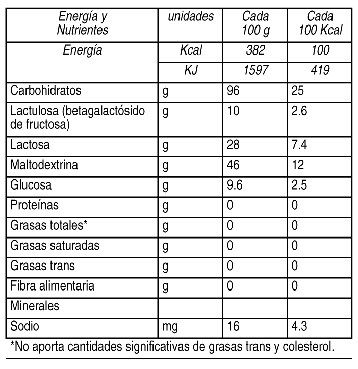 COMPOSICION: Ver Tabla Contiene: Maltodextrina, Lactosa, Lactulosa y Glucosa. Contiene derivados de leche. Puede contener derivados de pescado.