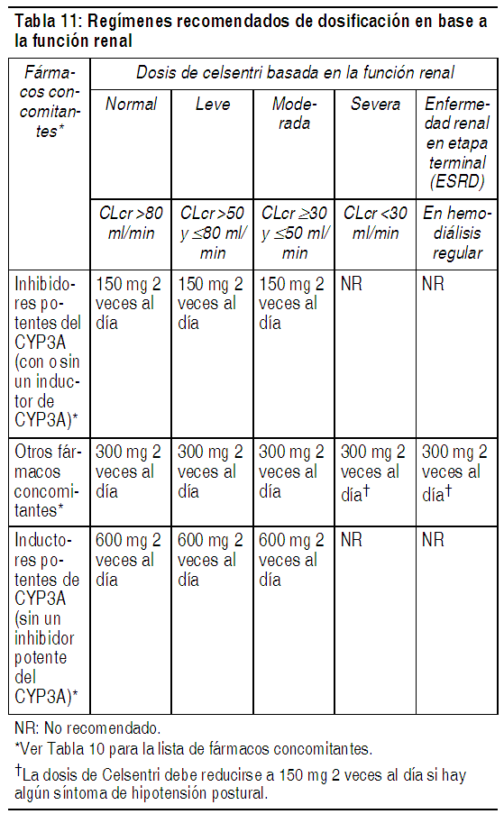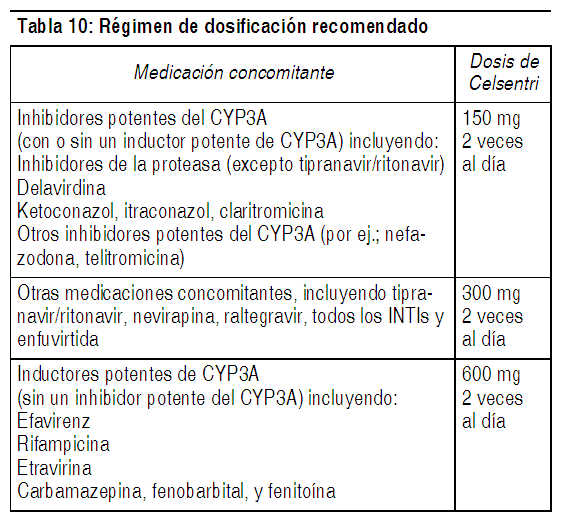 DOSIS: Recomendaciones de dosis para pacientes con función renal normal: La dosis recomendada de Celsentri difiere en base a la medicación concomitante, debido a las interacciones de fármacos (ver Tabla 10). Celsentri puede tomarse con o sin alimentos. Celsentri debe administrarse en combinación con otros medicamentos antirretrovirales. Ver Tabla Recomendaciones de dosis para pacientes con insuficiencia renal: La Tabla 11 proporciona recomendaciones de dosificación para pacientes en base a la función renal y la medicación concomitante. Ver Tabla