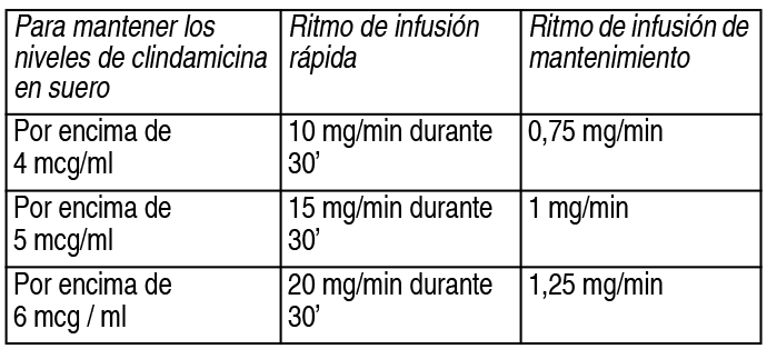 COMPOSICION: Cápsulas duras: Cada cápsula contiene: Clindamicina (como clorhidrato) 300 mg. Solución inyectable 900 mg: Cada ampolla de 6 ml contiene: Clindamicina (como Clindamicina fosfato) 900 mg. Solución inyectable 600 mg: Cada ampolla de 4 ml contiene: Clindamicina (como Clindamicina fosfato) 600 mg. Solución tópica dérmica: Cada 100 g de solución: Clindamicina fosfato 1.188 g (equivalente a 1 g de Clindamicina base). Crema vaginal: Cada 100 g contiene: Clindamicina fosfato 2.376 g (equivalente a 2 g de Clindamicina base). Óvulos vaginales: Cada óvulo contiene: Clindamicina (como fosfato) 100 mg. ACCION: Cápsulas duras y solución inyectable: Antibiótico de espectro reducido. Crema vaginal, Óvulos vaginales y Solución tópica dérmica: Antimicrobiano. INDICACIONES: Cápsulas: Clindamicina está indicada en el tratamiento de infecciones serias causadas por bacterias anaerobias susceptibles. Está indicada también para el tratamiento de infecciones serias causadas por cepas susceptibles de estreptococos, pneumococos y estafilococos. Anaerobios: Infecciones serias del tracto respiratorio, incluyendo empiema, pneumonitis anaeróbica, y abscesos intestinales; infecciones serias de la piel y de los tejidos blandos, septicemia, infecciones intraabdominales tales como peritonitis, accesos intraabdominales (causados por microorganismos anaeróbicos residentes normalmente en el tracto gastrointestinal), infecciones ginecológicas del tracto genitourinario tales como endometritis, abscesos tubo-ováricos no-gonocócicos, celulitis pélvica e infección vaginal post-quirúrgica. Streptococos: Infecciones serias del tracto respiratorio, infecciones serias de la piel y de los tejidos blandos. Staphilococos: Infecciones serias del tracto respiratorio, infecciones serias de la piel y de los tejidos blandos. Pneumococos: Infecciones serias del tracto respiratorio. Testeo de susceptibilidad in vitro: Se recomienda emplear el test de susceptibilidad (por discos de inhibición del crecimiento) en aquellas bacterias aeróbicas antes de indicar el empleo de clindamicina.Óvulos y Crema vaginal: Tratamiento de vaginosis bacterial. Otros patógenos comúnmente asociados con vulvovaginitis. Solución tópica: Este medicamento está indicado en el tratamiento del acné vulgaris. En vista de la potencial aparición de diarrea o colitis seudomembranosa el profesional deberá considerar el empleo de otros antibióticos más apropiados. DOSIS: Cápsulas duras y Solución inyectable: Vía de administración oral. Se debe administrar el medicamento con un vaso entero de agua para evitar la posible irritación esofágica. Puede tomarse con las comidas. Adultos: La dosis recomendada en adultos es de 600 a 1800 mg/día divididos en 2, 3 a 4 dosis iguales en función de la gravedad, del lugar de la infección y de la sensibilidad del microorganismo. La duración del tratamiento se debe determinar en función del tipo de infección y la respuesta del paciente y deberá ser lo más corta posible, en general, de 7 a 14 días. Ver Tabla Pacientes con insuficiencia renal / hepática: En pacientes con insuficiencia renal/hepática no se precisa ajuste de dosis, excepto en casos de deterioro grave de la función renal o hepática. Población pediátrica: Las cápsulas de clindamicina solo se deben usar en niños que sean capaces de tragar cápsulas. La dosis recomendada en niños mayores de 1 mes es de 8 a 25 mg/kg/día dividido en 3 ó 4 dosis iguales. Las capsulas deben ser tomadas enteras, lo que deberá de ser tenido en cuenta a la hora de administrar el medicamento. El uso de cápsulas puede no ser adecuado para proporcionar la dosis exacta en mg/kg necesaria para el tratamiento en niños. Con solución inyectable administrar de 20 a 40 mg/kg/día en 3 ó 4 dosis iguales. El dosaje más alto debe ser utilizado para infecciones más severas. En caso de infecciones estreptocócicas beta-hemolíticas, el tratamiento debe ser continuado durante 10 días como mínimo. En recién nacidos (menos de 1 mes): La dosis recomendada es 5 a 20 mg/kg/día en 3 a 4 dosis iguales por vía intravenosa o intramuscular. Duración del tratamiento con solución inyectable: En general, dependerá del tipo y la gravedad de la infección: En infecciones graves como la osteomielitis, pueden requerir al menos 6 semanas de tratamiento y en infecciones causadas por estreptococos beta-hemolíticos del grupo A en pacientes alérgicos a penicilinas se recomienda mantener el tratamiento durante al menos 10 días. Forma de administración: Administración intravenosa: Clindamicina fosfato debe ser diluida antes de la administración i.v. La concentración de clindamicina en diluyente para infusión no debe exceder los 18 mg/ml. Los ritmos de infusión no deben exceder los 30 mg/minuto. Las diluciones y ritmos de infusión usuales son los siguientes: Ver Tabla No se recomienda la administración de más de 1200 mg en una sola infusión durante 1 hora. Alternativamente, la droga puede ser administrada en la forma de infusión simple, rápida como primera dosis, seguido por infusión i.v. continua, de la siguiente forma: Ver Tabla Administración intramuscular: No se recomienda administrar inyecciones i.m. únicas superiores a los 600 mg. Dilución y compatibilidad: Los estudios de estabilidad físicos y biológicos controlados durante 24 horas a temperatura ambiente no han demostrado inactivación o incompatibilidad con el uso del producto en soluciones i.v que contienen cloruro de sodio, glucosa, calcio o potasio y soluciones que contengan complejo vitamínico B en las concentraciones utilizadas usualmente en la práctica clínica. No se ha demostrado incompatibilidad con los antibióticos cefalotina, kanamicina, gentamicina, penicilina o carbenicilina. Las siguientes drogas son físicamente incompatibles con clindamicina: ampicilina sódica, fenitoína sódica, barbitúricos aminofilina, gluconato de calcio y sulfato de magnesio. La comp