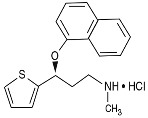 DESCRIPCIONES: Cymbalta® (cápsulas con gránulos con recubrimiento entérico) es un potente inhibidor de la recaptación neuronal de serotonina y norepinefrina (ISRSN) de administración oral. Su denominación química es clorhidrato de (+)-(S)-N-metil-λ-(1-naftiloxi)-2-tiofenopropilamina. La fórmula empírica es C18H19NOS·HCl, que corresponde a un peso molecular de 333.88. La fórmula estructural es: Ver Tabla El clorhidrato de duloxetina es un sólido de un color que va de blanco a blanco ligeramente pardo, y que es ligeramente soluble en agua.