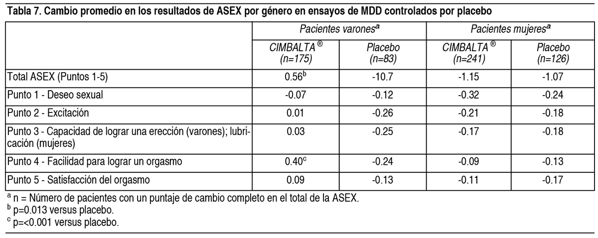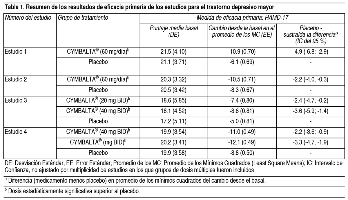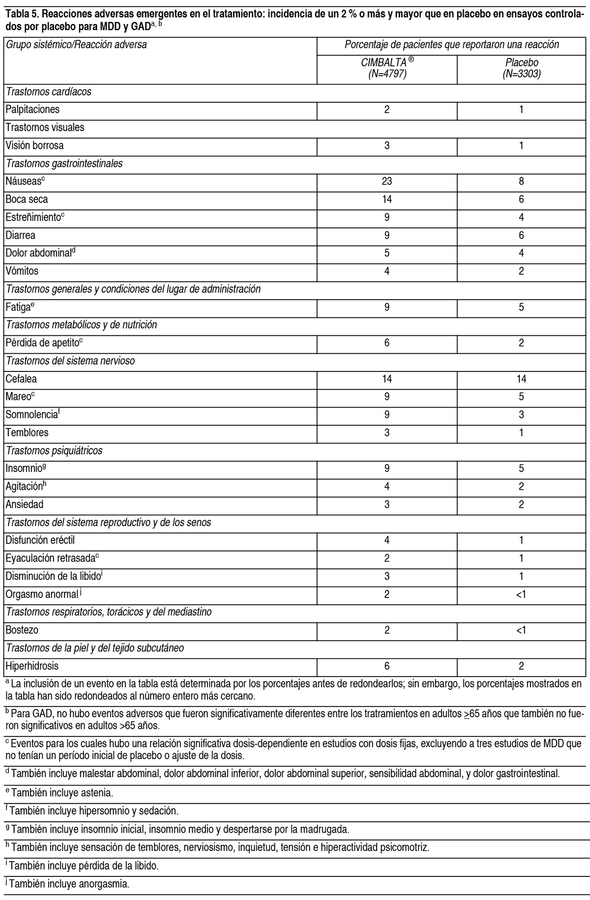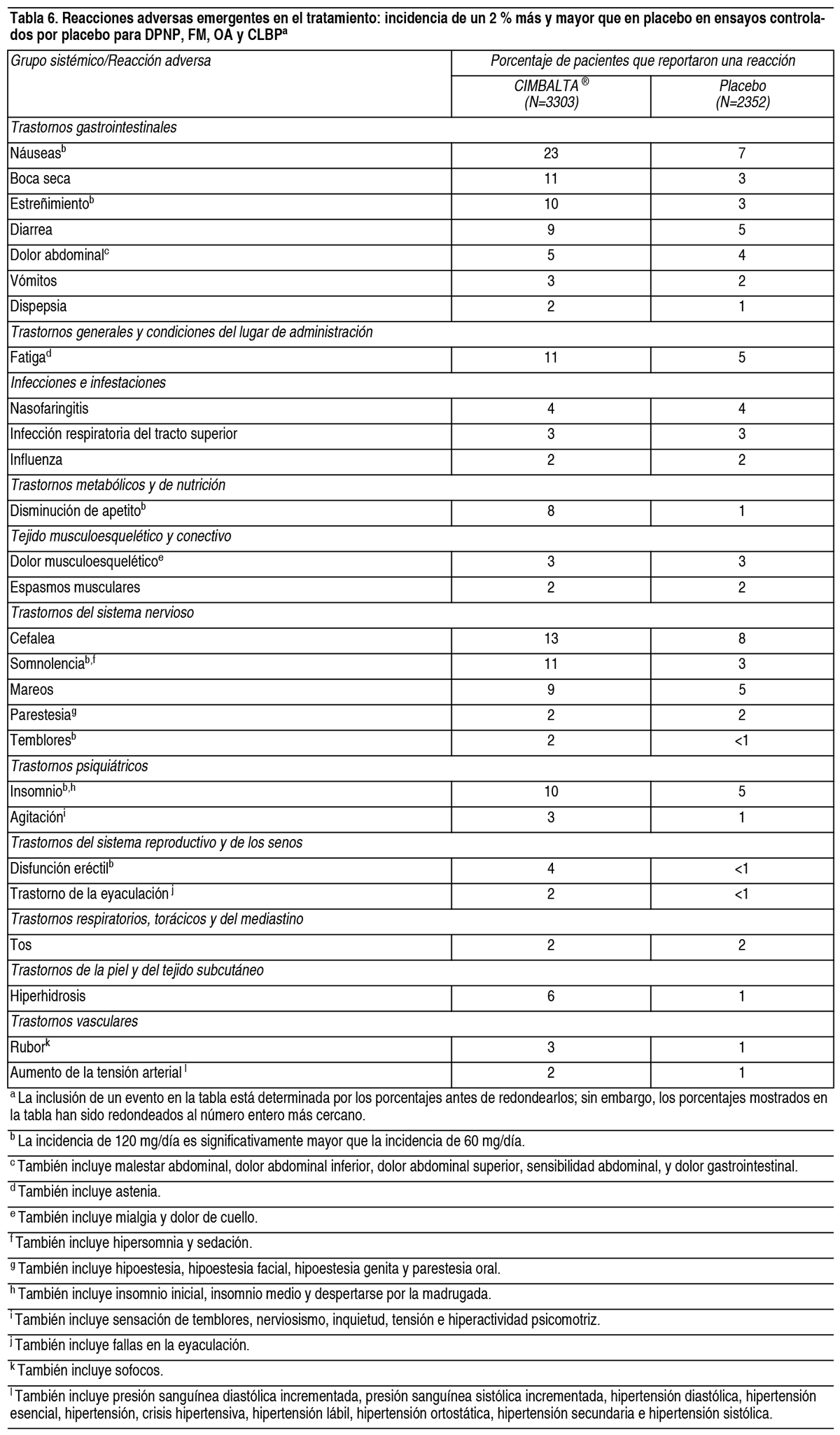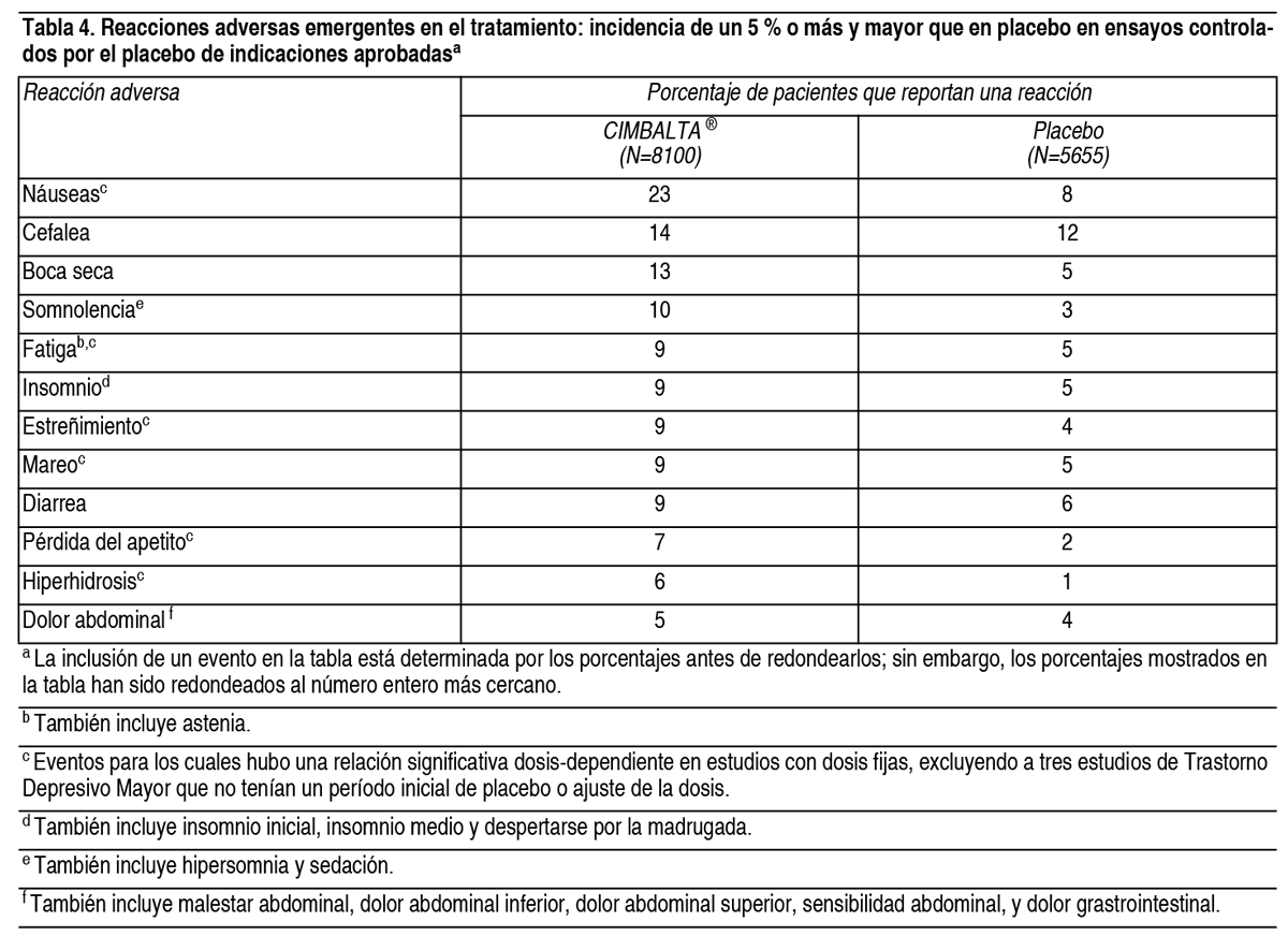 EFECTOS: Las siguientes reacciones adversas graves están descritas abajo y en otras secciones del prospecto: Pensamientos y comportamientos suicidas en adolescentes y jóvenes adultos [véase Advertencias y Precauciones Especiales de Uso]. Hepatotoxicidad [véase Advertencias y Precauciones Especiales de Uso]. Hipotensión ortostática, caídas y síncope [véase Advertencias y Precauciones Especiales de Uso]. Síndrome serotoninérgico [véase Advertencias y Precauciones Especiales de Uso]. Sangrado anormal [véase Advertencias y Precauciones Especiales de Uso]. Reacciones dermatológicas severas [véase Advertencias y Precauciones Especiales de Uso]. Discontinuación del tratamiento con Cymbalta® [véase Advertencias y Precauciones Especiales de Uso]. Activación de manía/hipomanía [véase Advertencias y Precauciones Especiales de Uso]. Glaucoma de ángulo estrecho [véase Advertencias y Precauciones Especiales de Uso]. Convulsiones [véase Advertencias y Precauciones Especiales de Uso]. Efectos sobre la tensión arterial [véase Advertencias y Precauciones Especiales de Uso]. Interacciones medicamentosas clínicamente importantes [véase Advertencias y Precauciones Especiales de Uso]. Hiponatremia [véase Advertencias y Precauciones Especiales de Uso]. Retención y vacilación urinaria [véase Advertencias y Precauciones Especiales de Uso]. Fuentes de información de los ensayos clínicos: Ya que los ensayos clínicos se realizan bajo condiciones sumamente variantes, los índices de reacciones adversas observados en los ensayos clínicos de un fármaco no pueden compararse directamente con los índices de los ensayos clínicos de otro fármaco y pueden no reflejar los índices observados en la práctica. Las frecuencias establecidas de las reacciones adversas representan la proporción de individuos que experimentaron, al menos 1 vez, una reacción adversa como producto del tratamiento del tipo enumerado. Se consideró que una reacción era producto del tratamiento si ocurría por primera vez o empeoraba al recibir la terapia después de la evaluación inicial. Las reacciones reportadas durante los estudios no fueron causadas necesariamente por la terapia, y las frecuencias no reflejan la impresión del investigador (evaluación) de causalidad. Adultos: La información descrita a continuación refleja la exposición a duloxetina en ensayos controlados por placebo para trastorno depresivo mayor (N=3779), trastorno de ansiedad generalizada (N=1018), OA (N=503), dolor crónico en la zona lumbar (N=600), dolor neuropático periférico de origen diabético (N=906), y FM (N=1294). La población estudiada tenía entre 17 y 89 años de edad; 65.7 %, 60.8 %, 60.6 %, 42.9%, y 94.4 % mujeres; y 81.8 %, 72.6 %, 85.3 %, 74.0 %, y 85.7 % de raza blanca para trastorno depresivo mayor, trastorno de ansiedad generalizada, OA y dolor crónico en la zona lumbar, dolor neuropático periférico de origen diabético, y FM, respectivamente. La mayoría de los pacientes recibió dosis totales de 60 a 120 mg diarias [véase Estudios Clínicos]. La información a continuación no incluye los resultados de los ensayos para la evaluación de la eficacia de Cymbalta® en pacientes ≥65 años de edad para el tratamiento del trastorno de ansiedad generalizada; sin embargo, las reacciones adversas observadas en la muestra geriátrica fueron comúnmente similares a las reacciones adversas en la población adulta general. Reacciones adversas reportadas como razones para discontinuar el tratamiento en ensayos en adultos controlados por placebo: Trastorno depresivo mayor: Aproximadamente un 8.4 % (319/3779) de los pacientes que recibieron Cymbalta® en ensayos controlados por placebo para trastorno depresivo mayor discontinuaron el tratamiento debido a una reacción adversa, en comparación con un 4.6 % (117/2536) de los pacientes que recibieron placebo. Las náuseas (1.1 % con Cymbalta®, 0.4 % con placebo) fueron la única reacción adversa común reportada como razón para discontinuar el tratamiento y se consideró que estaba relacionada al fármaco (es decir, la discontinuación ocurrió en al menos un 1 % de los pacientes tratados con Cymbalta® y a un índice de por lo menos el doble del placebo). Trastorno de Ansiedad Generalizada: Aproximadamente un 13.7 % (139/1018) de los pacientes que recibieron Cymbalta® en los ensayos controlados por placebo para trastorno de ansiedad generalizada discontinuaron el tratamiento debido a una reacción adversa, en comparación con un 5.0 % (38/767) que recibió el placebo. Las reacciones adversas comunes reportadas como razón para discontinuar el tratamiento y que se consideraron que estaban relacionadas al fármaco (según definición anterior) incluyen náuseas (3.3 % con Cymbalta®, 0.4 % con placebo), mareo (1.3 % con Cymbalta®, 0.4 % con placebo). Dolor neuropático periférico de origen diabético: Aproximadamente un 12.9 % (117/906) de los pacientes que recibieron Cymbalta® en ensayos controlados por placebo para el dolor neuropático periférico de origen diabético discontinuó el tratamiento debido a una reacción adversa, en comparación con un 5.1 % (23/448) que recibió el placebo. Las reacciones adversas comunes reportadas como razón para discontinuar el tratamiento y que se consideraron que estaban relacionadas al fármaco (según definición anterior) incluyen náuseas (3.5 % con Cymbalta®, 0.7 % con placebo), mareo (1.2 % con Cymbalta®, 0.4 % con placebo) y somnolencia (1.1 % con Cymbalta®, 0.0 % con placebo). Fibromialgia: Aproximadamente un 17.5 % (227/1294) de los pacientes que recibió Cymbalta® en ensayos de 3 a 6 meses controlados por placebo para la FM discontinuó el tratamiento debido a una reacción adversa, en comparación con un 10.1 % (96/955) que recibió placebo. Las reacciones adversas comunes reportadas como razón para discontinuar el tratamiento y que se consideraron que estaban relacionadas al fármaco (según definición ant