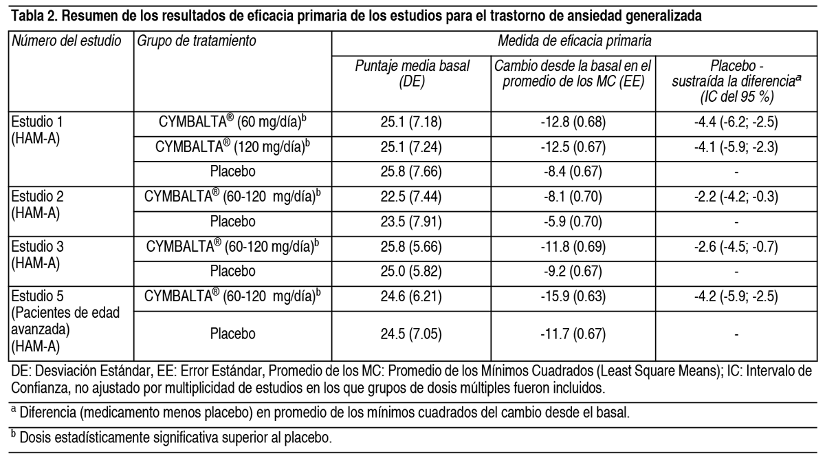 PROPIEDADES: Mecanismo de acción: Aunque los mecanismos exactos de los antidepresivos, las acciones centrales inhibidoras de dolor y ansiolíticas de la duloxetina en humanos aún no se conocen, se cree que estas acciones están relacionadas con su potenciación de actividad serotoninérgica y noradrenérgica en el SNC. Farmacodinámica: Estudios preclínicos han demostrado que la duloxetina es un potente inhibidor de la recaptación de serotonina y norepinefrina neuronal, y un inhibidor débil de la recaptación de dopamina. La duloxetina no tiene afinidad significativa por los receptores dopaminérgicos, adrenérgicos, colinérgicos, histaminérgicos, opioides, de glutamato y GABA in vitro. La duloxetina no inhibe la monoaminooxidasa (MAO). Cymbalta® se encuentra dentro de una clase de fármacos conocidos por afectar la resistencia uretral. Si se desarrollan síntomas de vacilación urinaria durante el tratamiento con Cymbalta®, debe considerarse la posibilidad de que ellos puedan estar relacionados con el fármaco. Farmacocinética: La duloxetina tiene una vida media de eliminación de alrededor 12 horas (rango entre 8 y 17 horas) y su farmacocinética es proporcional a la dosis en el rango terapéutico. Por lo general, las concentraciones plasmáticas en el equilibrio (Steady - State) se logran luego de 3 días de dosificación. La eliminación de la duloxetina ocurre principalmente a través del metabolismo hepático que involucra a 2 isoenzimas del Citocromo P450: la CYP2D6 y la CYP1A2. Absorción y distribución: Se logra una buena absorción del clorhidrato de duloxetina administrado por vía oral. Existe un lapso de tiempo de 2 horas y media hasta que empieza la absorción (lapso de T), las concentraciones plasmáticas máximas (Cmáx) de duloxetina ocurrirán 6 horas después de la dosis. Los alimentos no afectan la Cmáx de duloxetina, pero retrasan el tiempo que lleva alcanzar las concentraciones pico de 6 a 10 horas y, disminuyen ligeramente la extensión de la absorción (ABC) en aproximadamente 10 %. Existe un retraso de 3 horas en la absorción y un incremento de un tercio en la depuración aparente de la duloxetina durante la noche en comparación con la mañana. El volumen de distribución aparente promedio es de alrededor 1640 l. La duloxetina está altamente unida (>90 %) a las proteínas en el plasma humano, uniéndose principalmente a la albúmina y a la glicoproteína acídica α-1. La unión de la duloxetina a las proteínas plasmáticas no se ve afectada por el deterioro renal o hepático. Metabolismo y eliminación: La biotransformación y la disposición de la duloxetina en humanos han sido determinadas después de la administración oral de la duloxetina marcada con 14C. La duloxetina constituye cerca del 3 % del material total radiomarcado en el plasma, indicando que esta experimenta un extenso metabolismo hacia numerosos metabolitos. Las principales vías de biotransformación de la duloxetina incluyen la oxidación del anillo naftilo, seguido de una conjugación y posterior oxidación. Tanto la CYP2D6 como la CYP1A2 catalizan la oxidación del anillo de naftilo in vitro. Los 2 principales metabolitos encontrados en el plasma y orina son el glucurónido conjugado de 4-hidroxi duloxetina y el sulfato conjugado de 5-hidroxi, 6-metoxi duloxetina. Muchos metabolitos adicionales han sido identificados en la orina, algunos de ellos solo representaban vías menores de eliminación. Los principales metabolitos de circulación no son farmacológicamente activos. En la orina solo se encuentran trazas (<1 % de la dosis) de duloxetina sin cambio. La mayor parte (alrededor del 70 %) de la dosis de duloxetina aparece en la orina como metabolitos de la duloxetina; cerca del 20 % es excretado en las heces. Toxicología preclínica: Carcinogénesis, mutagénesis, daño a la fertilidad: Carcinogénesis: Se administró duloxetina en la dieta de ratas y ratones durante 2 años. En los ratones hembra que recibieron duloxetina en una dosis de 140 mg/kg/día (6 veces la dosis máxima recomendada para humanos (DMRH) de 120 mg/día sobre una base de mg/m2), hubo un incremento en la incidencia de adenomas hepatocelulares y carcinomas. La dosis para la que no se verificaron efectos fue 50 mg/kg/día (2 veces la DMRH). La incidencia de tumores no aumentó en los ratones macho que recibieron duloxetina en dosis de hasta 100 mg/kg/día (4 veces la DMRH). En el caso de las ratas, las dosis dietéticas de duloxetina de hasta 27 mg/kg/día en hembras (2 veces la DMRH) y hasta 36 mg/kg/día en machos (3 veces la DMRH) no aumentó la incidencia de tumores. Mutagénesis: La duloxetina no demostró potencial mutagénico en un ensayo de mutación bacteriana reversa in vitro (prueba Ames) y no demostró ser clastogénica en una prueba de aberración cromosómica in vivo realizada a células de la médula ósea de ratones. Además, no resultó genotóxica en un ensayo in vitro de mutación genética mamífera en células de linfoma de ratón o en un ensayo de síntesis de ADN in vitro no programado en hepatocitos de rata, ni tampoco indujo el intercambio de cromátidas hermanas en la médula ósea de un hámster chino in vivo. Daño a la fertilidad: La administración oral de duloxetina a ratas hembra o macho antes y durante el apareamiento en dosis de hasta 45 mg/kg/día (4 veces la DMRH) no alteró el apareamiento o la fertilidad. Estudios clínicos: Se ha establecido la eficacia de Cymbalta® en los siguientes estudios adecuados y bien controlados: Trastorno depresivo mayor (MDD por sus siglas en inglés): 4 estudios de corta duración y 1 estudio de mantenimiento en adultos [véase Estudios Clínicos]. Trastorno de ansiedad generalizada (GAD por sus siglas en inglés): 3 estudios de corta duración en adultos y 1 estudio de mantenimiento en adultos [véase Estudios Clínicos]. Dolor neuropático periférico de origen diabético (DPNP por sus siglas en inglés): 2 estudios de 12 semanas en a
