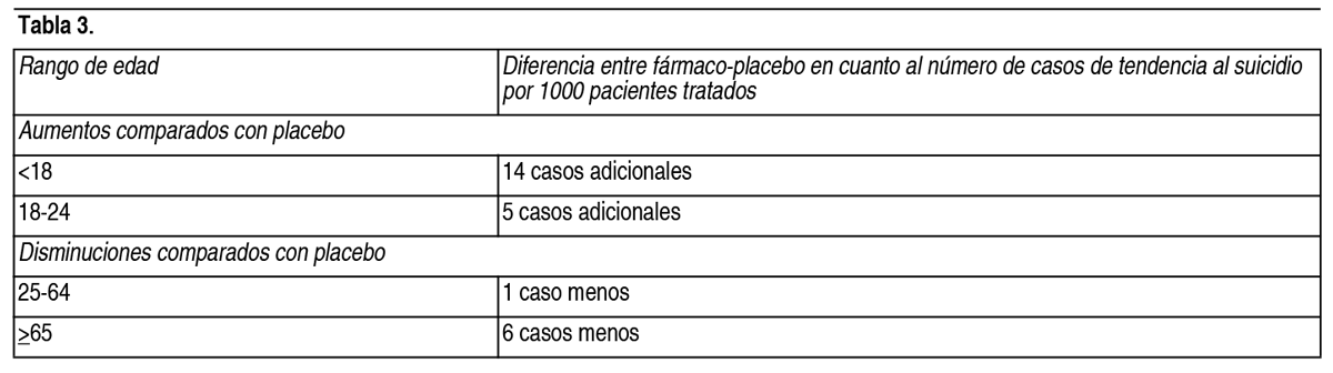 ADVERTENCIAS: Antes de iniciar la terapia con un antidepresivo, se deben investigar cuidadosamente los antecedentes psiquiátricos del paciente, incluyendo historia familiar y personal de suicidios y trastorno bipolar. Úsese sólo por indicación y bajo vigilancia médica. Pensamientos y conductas suicidas en adolescentes y adultos jóvenes: El uso de antidepresivos con indicación aprobada por ensayos clínicos controlados en adultos con trastorno depresivo mayor y otras condiciones psiquiátricas deberá establecerse en un marco terapéutico adecuado a cada paciente en particular. Esto incluye: Que la indicación sea hecha por médicos que puedan monitorear rigurosamente la emergencia de cualquier signo de agravamiento o aumento de la ideación suicida, como así también cambios conductuales con síntomas del tipo de agitación. Que se tengan en cuenta los resultados de los últimos ensayos clínicos controlados. Que se considere que el beneficio clínico debe justificar el riesgo potencial. Se han reportado los siguientes síntomas en pacientes adultos que están siendo tratados con antidepresivos para el trastorno depresivo mayor, así como para otras indicaciones, psiquiátricas y no psiquiátricas, ansiedad, agitación, ataques de pánico, insomnio, irritabilidad, hostilidad, agresividad, impulsividad, acatisia (inquietud psicomotriz), hipomanía y manía. Si bien no se ha establecido un vínculo entre la aparición de dichos síntomas y el empeoramiento de la depresión y/o la aparición de impulsos suicidas, existe la preocupación de que dichos síntomas pueden ser considerados precursores de comportamientos suicidas emergentes. Las familias y los responsables del cuidado de los pacientes que están siendo tratados con antidepresivos para el trastorno depresivo mayor, u otras indicaciones psiquiátricas y no psiquiátricas, deben estar prevenidos sobre la necesidad de monitorear a los pacientes y estar atentos ante la emergencia de síntomas como agitación, irritabilidad, cambios inusuales en la conducta, y los demás síntomas antes descritos, así como la aparición de la tendencia al suicidio, y reportarlos de inmediato a los profesionales de la salud. Dicho monitoreo debe incluir la observación diaria por parte de las familias y los responsables del cuidado de los pacientes. Si se ha decidido discontinuar el tratamiento, el medicamento debe ser reducido gradualmente tan pronto como sea posible, pero teniendo en cuenta que la discontinuación puede estar asociada a ciertos síntomas (véase Dosificación y Modo de Administración y Advertencias y Precauciones Especiales de Uso para conocer las descripciones de los riesgos de la discontinuación de Cymbalta®). La seguridad y eficacia de Cymbalta® no ha sido establecida en pacientes pediátricos menores de 18 años y su uso no está dirigido a este grupo etario. (Ver Contraindicaciones y Dosificación y Modo de Administración-Dosis en poblaciones especiales). Los pacientes con trastorno depresivo mayor, adultos y pediátricos, pueden experimentar un empeoramiento de su depresión y/o la aparición de pensamientos y conductas suicidas (tendencia al suicidio) o cambios inusuales en la conducta, ya sea que estén tomando medicamentos antidepresivos o no, y este riesgo podría persistir hasta que ocurran remisiones de importancia. Se sabe que el suicidio es un riesgo de la depresión y algunos otros trastornos psiquiátricos, y estos trastornos son los principales factores pronóstico del suicidio. Sin embargo, por mucho tiempo ha habido gran preocupación respecto a si los antidepresivos pueden tener un papel de inducción del empeoramiento de la depresión y la emergencia de la tendencia al suicidio en ciertos pacientes durante la etapa inicial del tratamiento. Los análisis combinados de ensayos a corto plazo controlados por placebo de fármacos antidepresivos (ISRS y otros) mostraron que estos fármacos elevan el riesgo de pensamientos y conductas suicidas (tendencia al suicidio) en niños, adolescentes y jóvenes adultos (entre 18 y 24 años) con trastorno depresivo mayor y otros trastornos psiquiátricos. Los estudios a corto plazo no demostraron un incremento en el riesgo de la tendencia al suicidio con el uso de antidepresivos en comparación con el placebo en adultos mayores de 24 años, mientras que hubo una reducción del riesgo con el uso de antidepresivos en comparación con el placebo en adultos mayores de 65 años. Los análisis combinados de ensayos controlados por placebo en niños y adolescentes que sufren trastorno depresivo mayor, trastorno obsesivo compulsivo (TOC), u otros trastornos psiquiátricos incluyeron un total de 24 ensayos a corto plazo de 9 fármacos antidepresivos en más de 4400 pacientes. Los análisis combinados de ensayos controlados por placebo en adultos con trastorno depresivo mayor u otros trastornos psiquiátricos incluyeron un total de 295 ensayos a corto plazo (duración promedio de 2 meses) de 11 fármacos antidepresivos en más de 77 000 pacientes. Hubo una variación considerable en el riesgo de la tendencia al suicidio entre los fármacos, aunque una tendencia al incremento en pacientes jóvenes en el caso de casi todos los fármacos estudiados. Hubo diferencias en el riesgo absoluto de la tendencia al suicidio entre las diferentes indicaciones, con una mayor incidencia en el caso del trastorno depresivo mayor. El riesgo de las diferencias (fármaco vs. placebo), sin embargo, fue relativamente estable dentro del grupo etario y entre las indicaciones. Estas diferencias en el riesgo (diferencia fármaco-placebo en el número de casos de tendencia al suicidio por 1000 pacientes tratados) son presentadas en la Tabla 3. Ver Tabla No se reportaron suicidios en ninguno de los ensayos pediátricos. Sí hubo, sin embargo, suicidios en los ensayos con adultos, pero el número no fue suficiente para llegar a alguna conclusión sobre el efecto del fármaco respecto al suicidio. Se desconoc