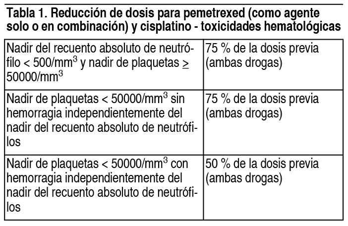 COMPOSICION: Ekel 100 mg: Cada frasco-ampolla contiene: Pemetrexed (como pemetrexed disódico hemipentahidrato) 100 mg, Manitol 100 mg, Ácido Clorhídrico e Hidróxido de Sodio c.s.p ajustar el pH. Agua para Inyectable c.s.p 4.00 ml. Ekel 500 mg: Cada frasco-ampolla contiene: Pemetrexed (como pemetrexed disódico hemipentahidrato) 500 mg, Manitol 500 mg, Ácido Clorhídrico e Hidróxido de Sodio c.s.p ajustar el pH. Agua para Inyectable c.s.p 20.00 ml. ACCION: Código ATC: L01BA04. Antineoplásico. Análogo del ácido fólico. INDICACIONES: Mesotelioma pleural maligno: Ekel® en combinación con cisplatino está indicado para el tratamiento de pacientes con mesotelioma pleural maligno cuya enfermedad no es resecable o que de cualquier modo no son candidatos a cirugía curativa. Cáncer de pulmón no células pequeñas: Ekel® está indicado en combinación con cisplatino para el tratamiento de primera línea de pacientes con cáncer de pulmón no células pequeñas localmente avanzado o metastásico, excepto en pacientes con histología escamosa. Ekel® está indicado como monoterapia para el tratamiento de segunda línea de pacientes con cáncer de pulmón no células pequeñas localmente avanzado o metastásico después de quimioterapia previa, excepto en pacientes con histología escamosa. Ekel® está Indicado como monoterapia para el tratamiento de mantenimiento de pacientes con cáncer de pulmón no células pequeñas localmente avanzado o metastásico, excepto en pacientes con histología escamosa, cuya enfermedad no ha progresado inmediatamente después de un régimen quimioterápico basado en un platino. DOSIS: Ekel® se debe administrar solo por vía intravenosa. Ekel® deba ser administrado solo bajo la supervisión de un médico calificado con experiencia en el uso de agentes antineoplásicos. Uso combinado con cisplatino: Mesotelioma pleural maligno: La dosis recomendada de pemetrexed es de 500 mg/m2 administrada como infusión intravenosa durante 10 minutos el día 1 de cada ciclo de 21 días. La dosis recomendada de cisplatino es de 75 mg/m2 infundida durante 2 horas comenzando aproximadamente 30 minutos después de finalizada la administración de pemetrexed. Los pacientes deberán recibir tratamiento antiemético adecuado y ser hidratados conforme a la práctica clínica local antes y/o después de recibir cisplatino. Uso como agente solo (monoterapia): Cáncer pulmonar a células no pequeña (su sigla en inglés NSCLC): La dosis recomendada de pemetrexed es de 500 mg/m2 administrada como infusión intravenosa durante 10 minutos el día 1 de cada ciclo de 21 días. Régimen de premedicación: Corticoesteroides: Se informó rash cutáneo con más frecuencia en los pacientes no tratados previamente con un corticoesteroide. El tratamiento previo con dexametasona (o equivalente) reduce la incidencia y la severidad de la reacción cutánea. En los estudios clínicos, se administraron 4 mg de dexametasona por vía oral 2 veces diarias el día de la administración de pametrexed, así como el día anterior y al día siguiente de la misma. Suplementación con vitamina: Para reducir la toxicidad, se debe indicar a los pacientes tratados con pemetrexed que diariamente tomen una dosis baja por vía oral de ácido fólico o complejo multivitamínico con ácido fólico. Durante el período de 7 días precedente a la primera dosis de pemetrexed, se deben tomar por lo menos 5 dosis diarias de ácido fólico; y la administración deberá continuar durante la totalidad del tratamiento y durante los 21 días posteriores a la última dosis de pemetrexed. Los pacientes deben recibir también 1 inyección por vía intramuscular de vitamina B12 durante la semana precedente a la primera dosis de pemetrexed y cada 3 ciclos de allá en más. Las inyecciones subsiguientes de vitamina B12 pueden administrarse el mismo día que pemetrexed. En los estudios clínicos, la dosis de ácido fólico estudiado varió de 350 a 1000 μg y la dosis de vitamina B12 fue de 1000 μg. La dosis más comúnmente utilizada de ácido fólico por vía oral en estudios clínicos fue de 400 μg. Recomendación para monitoreo de laboratorio y reducción de la dosis: Monitoreo: En todos los pacientes que reciban pemetrexed, se deberán realizar hemogramas completos, incluyendo recuentos plaquetarios. Los pacientes deberán ser monitoreados para determinar el nadir y la recuperación, los cuales fueron evaluados en el estudio clínico antes de cada dosis y en los días 8 y 15 de cada ciclo. Los pacientes no deberán comenzar un nuevo ciclo de tratamiento a menos que el recuento absoluto de neutrófilos sea ≥ 1500 células/mm3, el recuento plaquetario sea ≥ 100.000 células/mm3 y el clearance de creatinina sea ≥ 45 ml/min. Se deberán realizar pruebas químicas periódicas en sangre para evaluar la función renal y hepática. Recomendaciones para la reducción de la dosis: Los ajustes de la dosis al inicio de un ciclo subsiguiente deberán basarse en los recuentos de nadir hematológicos o en la toxicidad máxima no hematológica del ciclo de tratamiento precedente. El tratamiento puede ser demorado para permitir el tiempo suficiente para la recuperación. Al recuperarse, los pacientes deberán ser tratados nuevamente utilizando las recomendaciones que se presentan en las Tablas 1 a 3, las cuales son aplicables para pemetrexed usado como agente solo o en combinación con cisplatino. Ver Tabla Si los pacientes desarrollan toxicidades no hematológicas (excluyendo neurotoxicidad) ≥ grado 3 (excepto aumentos de las transaminasas de grado 3), se deberá suspender la administración de pemetrexed hasta la resolución a un valor inferior o idéntico al que tenía el paciente antes del tratamiento. El tratamiento deberá ser reanudado de acuerdo con los lineamientos de la Tabla 4. Ver Tabla En el caso de neurotoxicidad, los ajustes de dosis recomendados para pemetrexed y cisplatino se describen en la Tabla 3. Los paciente
