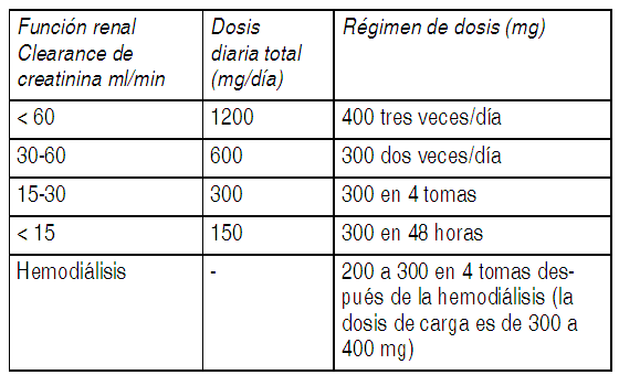 DOSIS: Este medicamento se administra por vía oral asociado o no a los alimentos. Mayores de 12 años: la dosis efectiva de gabapentina es de 900 a 1800 mg/día administrados en dosis divididas (3 veces/día). Dosis máxima de 1800 mg diarios. Pacientes pediátricos de rango etario de 3 a 12 años: la dosis de comienzo debe oscilar entre los 10 y los 15 mg/kg/día dividida en 3 tomas y la dosis efectiva es alcanzada en 3 días, incrementándola mediante la titulación. La dosis efectiva de gabapentina en pacientes de 5 años y de mayor edad es de 25-35 mg/kg/día, administrada en 3 dosis en 24 horas. En niños de 3 y 4 años, la dosis efectiva es de 40 mg/kg/día, también en 3 tomas diarias. La dosis ajustada en pacientes ≥ a 12 años con función renal comprometida o sometidos a hemodiálisis, es la siguiente: Ver Tabla El empleo de gabapentina en menores de 12 años con función renal comprometida no ha sido estudiado. Pacientes ancianos: se iniciará con la dosis más baja y se evaluará periódicamente la respuesta terapéutica. Pacientes con trastornos hepáticos: se recomienda emplear las dosis menores efectivas en pacientes que padecen trastornos hepáticos.