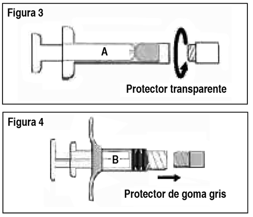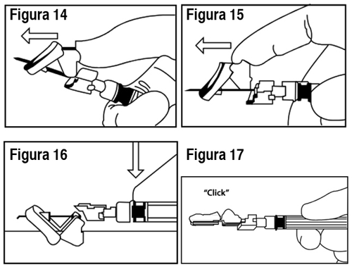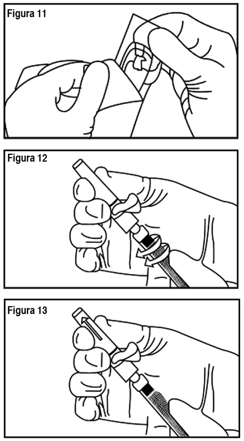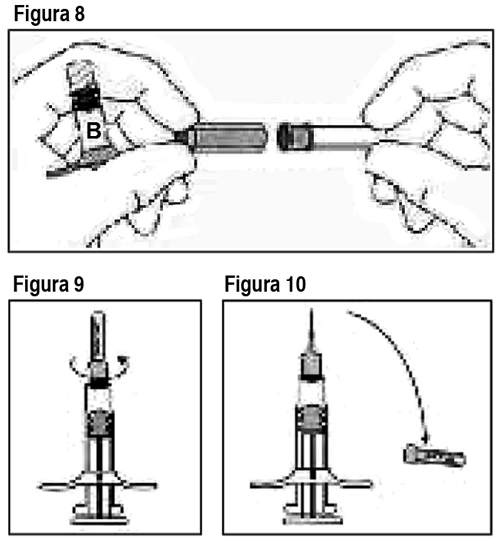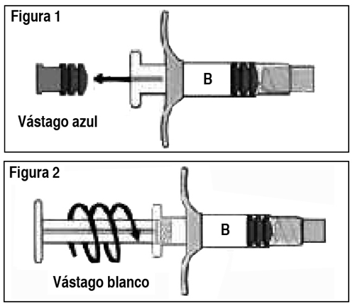 USO: Método de preparación y administración: Ver Tabla Importante: Deje que el producto alcance temperatura ambiente antes de usarlo. Una vez mezclado, el producto debe administrarse dentro de los 30 minutos. Siga las instrucciones para garantizar la preparación adecuada de Eligard® antes de la administración: Eligard® se envasa en 2 bandejas termoformadas. Cada caja contiene: 1 jeringa estéril (Jeringa A), prellenada con el sistema de distribución Atrigel®. 1 jeringa estéril (Jeringa B) prellenada con polvo de acetato de leuprolide. 1 vástago del émbolo blanco largo para uso con la Jeringa B. 1 aguja estéril o 1 aguja estéril de seguridad. Paquetes de desecantes. 1. En un lugar limpio, abra todos los envases exteriores y extraiga el contenido. Elimine los paquetes de desecantes. 2. Retire el vástago del émbolo corto azul con el tapón gris adherido de la Jeringa B y deseche (Figura 1). Gire el vástago del émbolo largo, blanco, de reemplazo, dentro del tapón primario gris que queda en la Jeringa B (Figura 2). Ver Tabla 3. Desenrosque el protector transparente de la Jeringa A (Figura 3). Elimine el protector gris de goma de la Jeringa B (Figura 4). Ver Tabla 4. Acople bien las dos jeringas presionando y girando hasta que queden aseguradas (Figura 5). Ver Tabla 5. Inyecte el contenido de líquido de la Jeringa A en la Jeringa B que contiene acetato de leuprolide. Mezcle bien el producto empujando el contenido hacia atrás y adelante entre las jeringas para obtener una suspensión uniforme (Figura 6). Una vez que se mezcla por completo, la suspensión tendrá un aspecto de color marrón claro a marrón (Eligard® 7.5 mg) o incoloro a amarillo claro (Eligard® 22.5 mg y 45 mg). Por favor tenga en cuenta que el producto debe mezclarse tal como se describe. No lo agite, ya que NO se mezclará adecuadamente. Ver Tabla 6. Luego del mezclado, mantenga las jeringas en forma vertical con la Jeringa B abajo. Las jeringas deben mantenerse acopladas de manera segura. Vierta todo el producto mezclado en la Jeringa B (jeringa corta, ancha) oprimiendo el émbolo de la Jeringa A y retirando suavemente el émbolo de la Jeringa B. Desenrosque la Jeringa A mientras continúa empujando el émbolo de la Jeringa A (Figura 7). Nota: en la formulación quedarán pequeñas burbujas de aire. Esto es aceptable. Ver Tabla 7. Mantenga la Jeringa B en posición vertical. Quite el protector de la base del cartucho de la aguja estéril haciéndolo girar (Figura 8). Coloque el cartucho de la aguja en el extremo de la Jeringa B (Figura 9) empujando y haciendo girar la aguja hasta que esté ubicada firmemente. No haga sobregirar la aguja en la jeringa porque puede salirse la tapa. Retire el protector transparente del cartucho de la aguja antes de la administración (Figura 10). Ver Tabla [Corresponde al kit de Eligard de uso único de un sistema de mezcla de 2 jeringas con aguja estéril]. 8. Mantenga la Jeringa B en posición vertical. Abra el paquete de la aguja de seguridad estéril quitando la solapa de papel y retire la aguja de seguridad (Figura 11). Asegure la aguja al extremo de la Jeringa B sosteniendo la funda protectora de la aguja y girando la jeringa en el sentido de las agujas del reloj para colocar completamente la aguja (Figura 12). Retire la funda protectora de la aguja antes de la administración (Figura 13). Ver Tabla [Corresponde al kit de Eligard® de uso único de un sistema de mezcla de 2 jeringas con aguja de seguridad estéril]. Procedimiento de administración: Importante: Deje que el producto alcance temperatura ambiente antes de mezclarlo. Una vez mezclado, el producto debe administrarse dentro de los 30 minutos. Ver Tabla 1. Como lugar de aplicación, elija un lugar en el abdomen, parte superior de los glúteos u otro lugar con suficiente tejido subcutáneo que no posea pigmentación, nódulos, lesiones o vello en exceso. Como se puede variar el lugar de inyección para la inyección, elija un área que no se haya utilizado recientemente. 2. Limpie el lugar de inyección con un algodón embebido en alcohol. 3. Utilizando el pulgar y el índice de su mano no dominante, tome y abulte el área de la piel en torno al lugar de inyección. 4. Utilizando su mano dominante, inserte la aguja rápidamente con un ángulo de 90º en la superficie de la piel. La profundidad de la penetración dependerá del volumen de tejido subcutáneo y de la longitud de la aguja. Una vez insertada la aguja, suelte la piel con su mano no dominante. 5. Inyecte el fármaco empujando lenta y sostenidamente. Presione el émbolo hasta que la jeringa esté vacía. 6. Retire la aguja rápidamente en el mismo ángulo de 90º utilizado para la inserción. [El paso 7 aplica solamente al kit de uso único de Eligard® de un sistema de mezcla de 2 jeringas con aguja de seguridad estéril]. 7. Inmediatamente después de retirar la aguja, active la cubierta de seguridad en la aguja usando un pulgar (Figura 14) o dedo (Figura 15) o superficie plana (Figura 16) para empujarla hasta que cubra por completo la punta de la aguja y quede fija en su lugar. El sonido de un clic verifica la posición de bloqueo de la cubierta de seguridad (Figura 17). Ver Tabla 8. Deseche todos los componentes de manera segura en un recipiente apropiado para material con riesgo biológico.