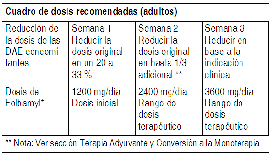 COMPOSICION: Suspensión oral: Cada 5 ml contienen: Felbamato Micronizado 600 mg. Excipientes c.s. Comprimidos: Cada comprimido contiene: Felbamato 600 mg. Excipientes c.s. INDICACIONES: Felbamyl no está indicado como tratamiento antiepiléptico de primera elección. Felbamyl (felbamato) se recomienda únicamente en aquellos pacientes que responden inadecuadamente a los tratamientos alternativos, y cuya epilepsia es tan grave, que el riesgo de anemia aplásica y/o insuficiencia hepática se estima aceptable a la luz de los beneficios conferidos por su uso. Si se reúnen estos criterios y el paciente ha sido plenamente advertido acerca de los riesgos, se puede considerar el uso de Felbamyl, ya sea como monoterapia o terapia adyuvante en el tratamiento de las crisis parciales, con o sin generalización, en adultos con epilepsia, y como terapia adyuvante en el tratamiento de las crisis focalizadas y generalizadas asociadas con el Síndrome de Lennox-Gastaut en niños. Se debe realizar una cuidadosa evaluación de la eficacia luego de 2 ó 3 meses del tratamiento. Sólo aquellos pacientes que han obtenido una mejoría clínica en los trastornos convulsivos (Por ej.: una marcada reducción en la frecuencia o severidad de convulsiones) dentro de este período de tiempo deben continuar con el tratamiento con Felbamato. Felbamato sólo debe ser utilizado bajo la supervisión de un neurólogo o pediatra con experiencia en tratamiento de epilepsia. DOSIS: Se estudió el uso de Felbamyl como monoterapia y terapia adyuvante en adultos y como terapia adyuvante en niños con crisis asociadas al síndrome de Lennox-Gastaut. Como Felbamyl se usa en forma concomitante o sustituye a las DAE (drogas antiepilépticas) existentes, se recomienda enfáticamente reducir las dosis de dichas DAE entre un 20 y un 33%, para minimizar los efectos colaterales. Ajuste de la dosis en pacientes con función renal deteriorada: Felbamato debe ser utilizado con cuidado en pacientes con disfunción renal. En estos pacientes, el comienzo y mantenimiento de las dosis deben reducirse a la mitad. El tratamiento adyuvante con medicamentos que afectan las concentraciones plasmáticas de felbamato, especialmente los DAE, pueden justificar una mayor reducción en las dosis diarias de felbamato en pacientes con disfunción renal. Adultos (14 años de edad o mayores): La mayoría de los pacientes recibieron 3.600 mg/día en los estudios clínicos que evaluaron su uso como monoterapia y como terapia adyuvante. Monoterapia: (Terapia inicial) Felbamyl no ha sido evaluado sistemáticamente como monoterapia inicial. Se sugiere comenzar con 1.200 mg/día de Felbamyl en dosis divididas, tres o cuatro veces diarias. En aquellos pacientes que no han recibido tratamiento previo se deberá realizar la titulación del fármaco bajo estricta vigilancia médica, aumentando la dosis 600 mg cada 2 semanas hasta 2.400 mg/día, de acuerdo a la respuesta clínica, y luego hasta 3600 mg/día, si está clínicamente indicado. Conversión a la monoterapia: Se sugiere comenzar con 1.200 mg/día de Felbamyl divididos en tres o cuatro dosis diarias. Reducir la dosis de la terapia antiepiléptica concomitante a la tercera parte al iniciar el tratamiento con Felbamyl. En la semana 2, aumentar la dosis de Felbamyl hasta alcanzar 2.400 mg/día, al tiempo que se reduce la dosis de las otras DAE un tercio adicional con respecto a la dosis inicial. En la tercera semana, aumentar la dosis de Felbamyl hasta alcanzar 3.600 mg/día y continuar reduciendo la dosis de las DAE restantes de acuerdo a la indicación clínica. Terapia adyuvante: Se deberán adicionar 1.200 mg/día de Felbamyl, divididos en tres o cuatro dosis diarias, mientras se reduce la dosis de las DAE administradas en un 20%, con el objeto de controlar las concentraciones plasmáticas de fenitoína, ácido valproico, fenobarbital y carbamazepina y sus metabolitos, utilizadas en forma concurrente. Podrá ser necesario reducir aún más las dosis de las DAE utilizadas en forma concomitante para minimizar los efectos colaterales debidos a las interacciones farmacológicas. Aumentar la dosis de Felbamylcon incrementos de 1.200 mg/día a intervalos semanales hasta alcanzar 3.600 mg/día. La mayoría de los efectos colaterales observados durante la terapia adyuvante con Felbamyl se resuelven a medida que disminuye la dosis de las DAE concomitantes. Ver Tabla Si bien los lineamientos para la conversión al uso de Felbamyl antes indicados requieren 3 semanas para alcanzar la dosis de 3600 mg/día, en algunos pacientes, la titulación para llegar a la dosis de 3600 mg/día de Felbamyl se consiguió en tan sólo 3 días, con el apropiado ajuste del resto de las DAE. Niños con síndrome de Lennox-Gastaut (entre 2 y 14 años de edad): Terapia adyuvante: Se deberán adicionar 15 mg/kg/día de Felbamyl, divididos en 3 ó 4 dosis diarias, mientras se reduce la dosis de las DAE administradas en un 20%, con el objeto de controlar las concentraciones plasmáticas de fenitoína, ácido valproico, fenobarbital y carbamazepina y sus metabolitos, utilizadas en forma concurrente. Podrá ser necesario reducir aún más la dosis de las DAE utilizadas en forma concomitante para minimizar los efectos colaterales provocados por las interacciones farmacológicas. Aumentar la dosis de Felbamyl con incrementos de 15 mg/kg/día a intervalos semanales hasta alcanzar los 45 mg/kg/día. La mayoría de los efectos colaterales observados durante la terapia concurrente con Felbamyl se resuelven a medida que disminuye la dosis de las DAE concomitantes. Información para los pacientes: Se deberá informar a los pacientes que el uso de Felbamyl está asociado con anemia aplásica e insuficiencia hepática, condiciones potencialmente fatales tanto en forma aguda como a largo plazo. El médico debe obtener el consentimiento escrito firmado por el paciente previamente a la iniciación de la terapia con Felbamyl. PRESENTACIONES: Felbamyl Suspens