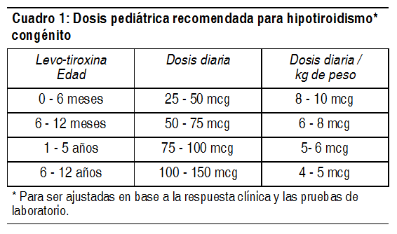 DOSIS: El objetivo de la terapia debe ser el restablecimiento del eutiroidismo conforme a lo que se observe por la respuesta clínica y la confirmación por valores adecuados de laboratorio. En adultos, sin enfermedad endocrina o cardiovascular que obstaculice, la dosis completa estimada de mantenimiento se puede lograr inmediatamente con ajustes efectuados conforme a lo indicado por la evaluación clínica. La dosis habitual de mantenimiento de levotiroxina es de 100 a 200 mcg. En pacientes con antecedentes de complicaciones o en caso de duda, se recomienda la titulación de la dosis individual a intervalos de 2 a 4 semanas. La dosis habitual inicial es de 50 mcg con incrementos de 50 mcg a intervalos de 2 a 4 semanas hasta que el paciente sea eutiroideo o que los síntomas confirmen la discontinuación de los incrementos de dosis. En pacientes adultos con mixedema o hipotiroideos con angina, la dosis inicial debe ser 25 mcg con incrementos de 25 a 50 mcg a intervalos de 2 a 4 semanas, conforme con la respuesta clínica. El coma mixedémico se presenta generalmente en los pacientes hipotiroideos de larga data por enfermedad intercurrente o drogas tales como sedantes y anestésicos, y debe considerarse como una emergencia médica. La terapia debe apuntar a la corrección de los trastornos electrolíticos y posible infección, además de la administración de hormonas tiroideas. Se deben administrar los corticosteroides en forma rutinaria. Se puede administrar T4 y T3 a través de sonda nasogástrica, pero la vía de administración preferida para ambas hormonas es la I.V. La levotiroxina sódica (T4) se administra a una dosis inicial de 200 - 500 mcg (100 mcg/ml administrados rápidamente) y es habitualmente bien tolerada, aún en ancianos. A esta dosis inicial siguen dosis suplementarias diarias de 100 a 200 mcg, por vía I.V. Los niveles normales de T4 se alcanzan en 24 horas, luego de lo cual, en 3 días se produce una triplicación de T3. La terapia oral con levotiroxina debe reiniciarse tan pronto como se ha estabilizado la situación clínica y el paciente se halla en condiciones de tomar una medicación oral. La dosificación pediátrica debe realizarse conforme a las recomendaciones resumidas en el Cuadro 1. En infantes con hipotiroidismo congénito, se debe instituir la terapia con la dosis total, tan pronto como se haya efectuado el diagnóstico. La levotiroxina puede administrarse en infantes y niños que no puedan tragar los comprimidos enteros, triturándolos y mezclando con una pequeña cantidad de agua u otros líquidos. La suspensión puede administrarse con una cuchara o gotero. Nunca conserve la suspensión. El comprimido triturado también puede espolvorearse sobre una pequeña cantidad de alimento, tales como cereal cocido o puré de manzanas. Ver Tabla