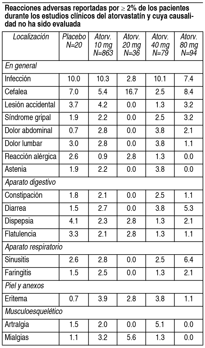 COMPOSICION: Comprimidos recubiertos 10 mg: Atorvastatín Cálcico Trihidrato (equivalente a 10 mg de Atorvastatín) 10.85 mg. Comprimidos recubiertos 20 mg: Atorvastatín Cálcico Trihidrato (equivalente a 20 mg de Atorvastatín) 21.7 mg. Comprimidos recubiertos 40 mg: Atorvastatín Cálcico Trihidrato (equivalente a 40 mg de Atorvastatín) 43.4 mg. Excipientes: Avicel PH102, Vivapur, Lactosa Monohidrato CD, AC-DI-SOL, Estearato de Magnesio, Aerosil, Opadry IS-7003, Carbowax 6000, Propilenglicol, Oxido de Hierro Amarillo. ACCION: Antilipémico, inhibidor de la HMG-CoA reductasa. INDICACIONES: Liponorm está indicado como adyuvante de la dieta en el tratamiento de la hipercolesterolemia (hiperlipoproteinemia tipos iia y iib) causada por elevadas concentraciones de lipoproteínas de baja densidad (colesterol ldl) en pacientes con alto riesgo de enfermedad vascular coronaria, cuando la respuesta a la dieta y otras medidas es inadecuada. También es útil para reducir las concentraciones elevadas del colesterol LDL en aquellos pacientes con hipercolesterolemia combinada con hipertrigliceridemia. DOSIS: Adultos: Las dosis deben adaptarse a cada paciente en particular de acuerdo con los niveles séricos de colesterol LDL, el objetivo del tratamiento y la respuesta obtenida. La dosis inicial recomendada es de 10 mg diarios, administrados en una sola toma por la noche, que pueden ingerirse con alimentos o no. Si es necesario, la dosificación se incrementa, con intervalos de 4 semanas, hasta un máximo de 80 mg diarios. En pacientes que están tomando en forma simultánea medicamentos inmunosupresores, se recomienda iniciar el tratamiento con 5 mg por día y no exceder los 10 mg diarios. Dado que no se excreta en cantidad significativa por vía renal, no es necesario ajustar la dosis en pacientes con insuficiencia renal moderada. Liponorm es eficaz cuando se lo emplea solo o asociado con secuestrantes de los ácidos biliares. Niños: La seguridad y la eficacia del atorvastatín en los niños aún no han sido establecidas. CONTRAINDICACIONES: Hipersensibilidad a cualquiera de los componentes de este medicamento o a otros inhibidores de la HMG-COA reductasa. Enfermedad hepática activa o elevaciones persistentes de las transaminasas séricas sin causa conocida. Embarazo. Lactancia. Mujeres en edad fértil que no utilicen un método anticonceptivo adecuado. EFECTOS: El atorvastatín es generalmente bien tolerado y las reacciones adversas reportadas han sido leves y transitorias. En los ensayos clínicos controlados menos del 2% de los pacientes discontinuaron el tratamiento debido a efectos adversos atribuibles al atorvastatín. Los efectos adversos más frecuentemente (≥ 1%) informados durante los estudios clínicos fueron: constipación, flatulencia, dispepsia, dolor abdominal. Ver Tabla Reacciones adversas reportadas por ≤ 2% de los pacientes durante los estudios clínicos del atorvastatín y cuya causalidad no ha sido evaluada: Generales: edema facial, fiebre, rigidez cervical, malestar, reacción de fotosensibilidad, edema generalizado. Aparato digestivo: gastroenteritis, tests anormales de funcionamiento hepático, colitis, vómitos, gastritis, boca seca, hemorragia rectal, esofagitis, eructos, glositis, ulceración de la boca, anorexia, aumento del apetito, estomatitis, dolor biliar, queilitis, úlcera duodenal, disfagia, enteritis, melena, hemorragia gingival, úlcera gástrica, tenesmo, estomatitis ulcerativa, hepatitis, pancreatitis, ictericia colestásica. Aparato respiratorio: neumonía, disnea, asma, epistaxis. Sistema nervioso: parestesias, somnolencia, amnesia, alteraciones del sueño, disminución de la libido, hiperemocionalidad, incoordinación, neuropatía periférica, tortícolis, parálisis facial, hipercinesia. Aparato musculoesquelético: calambres musculares, bursitis, tenosinovitis, miastenia, contracturas tendinosas, miositis. Piel y anexos de la piel: prurito, dermatitis de contacto, alopecia, piel seca, sudación, acné, urticaria, eccema, seborrea, úlceras de la piel. Aparato urogenital: aumento de la frecuencia urinaria, cistitis, hematuria, impotencia, disuria, litiasis renal, epididimitis, enfermedad fibroquística de la mama, hemorragia vaginal, albuminuria, agrandamiento de las mamas, menorragia, nefritis, incontinencia urinaria, eyaculación anormal. Sentidos especiales: ambliopía, tinnitus, sequedad de la conjuntiva, alteraciones de la refracción, ojo rojo, sordera, parosmia, pérdida del gusto, disgeusia. Aparato cardiovascular: palpitaciones, vasodilatación, síncope, migraña, hipotensión postural, flebitis, arritmia. Alteraciones metabólicas y funcionales: hiperglucemia, aumento de la creatinfosfocinasa sérica (CPK), gota, aumento del peso corporal, hipoglucemia. Sangre y sistema linfático: equimosis, anemia, linfadenopatía, trombocitopenia, petequias. PRECAUCIONES: Se recomienda efectuar un examen de la función hepática antes de iniciar el tratamiento y periódicamente durante su transcurso. Ante un aumento de las transaminasas, se repetirá rápidamente la determinación para confirmarla y luego se controlará a intervalos más cortos. Si el nivel de transaminasas aumenta al triple de su límite máximo normal y éste es persistente, el tratamiento debe ser interrumpido. Liponorm debe ser utilizado con precaución en pacientes que consumen importantes cantidades de alcohol o tienen antecedentes de enfermedad hepática. En pacientes tratados con atorvastatín, se observó frecuentemente un aumento leve y transitorio de la concentración plasmática de la creatinfosfocinasa (CPK) muscular, sin alcanzar habitualmente repercusión clínica. Se han informado raros casos de rabdomiólisis con insuficiencia renal secundaria a mioglobinuria cuando se administran inhibidores de la HMG-CoA reductasa solos o simultáneamente con otros fármacos, como agentes inmunosupresores (incluida la ciclosporina en pacientes con trasplante cardíaco), gemfibrozil;