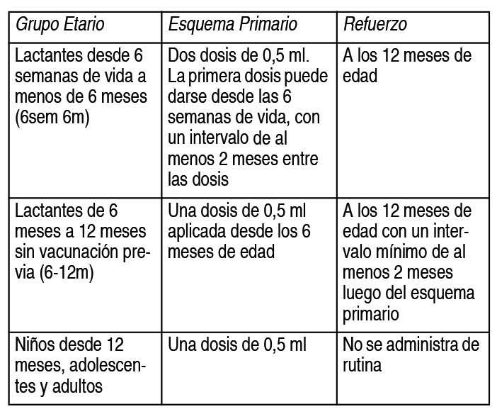 COMPOSICION: Cada dosis (0.5 ml de vacuna reconstituida) contiene: Polisacárido de Neisseria Meningitidis del grupo A1 5 mcg; Polisacárido de Neisseria Meningitidis del grupo C1 5 mcg; Polisacárido de Neisseria Meningitidis del grupo W-1351 5 mcg; Polisacárido de Neisseria Meningitidis del grupo Y1 5 mcg; 1conjugado con Toxoide Tetánico como Proteína Transportadora 44 mcg. Excipientes: Polvo liofilizado: Sacarosa y Trometamol. Disolvente: Cloruro de Sodio y Agua para Preparaciones Inyectables. Forma farmacéutica: Polvo y disolvente para solución inyectable. El polvo o pasta es de color blanco. El disolvente es transparente e incoloro. ACCION: Vacuna antimeningococo. Código ATC: J07AH08. INDICACIONES: Nimenrix está indicado para la inmunización activa de lactantes (a partir de 6 semanas de edad), niños, adolescentes y adultos frente a enfermedad meningocócica invasiva causada por Neisseria meningitidis de los grupos A, C, W-135, e Y. DOSIS: El uso de Nimenrix debe realizarse conforme con las recomendaciones oficiales. Esquema primario: Lactantes desde las 6 semanas y menos de 6 meses de edad: Se deben administrar 2 dosis, cada una de 0.5 ml, con un intervalo de 2 meses entre dosis. Lactantes desde los 6 meses de edad, niños, adolescentes y adultos: Se debe administrar una única dosis de 0.5 ml. Se puede considerar apropiada una dosis primaria adicional de Nimenrix para algunas personas. Dosis de refuerzo: Después de completar el ciclo primario de vacunación en lactantes entre 6 semanas y menos de 12 meses de edad, se debe administrar una dosis de refuerzo a los 12 meses de edad con un intervalo de al menos 2 meses después de la última vacunación con Nimenrix. En niños desde 12 meses, adolescentes y adultos vacunados previamente, Nimenrix puede ser administrada como dosis de refuerzo si han recibido vacunación primaria con una vacuna antimeningocócica conjugada o polisacárida simple. Ver Tabla Forma de administración: La inmunización debe realizarse únicamente mediante una inyección intramuscular. En los lactantes, el lugar de inyección recomendado es la cara anterolateral del muslo. En niños a partir del año de edad, adolescentes y adultos, el lugar de inyección recomendado es la cara anterolateral del muslo o el músculo deltoides. PRESENTACIONES: Envase conteniendo frasco-ampolla con polvo liofilizado y jeringa prellenada con disolvente para solución inyectable con 2 agujas. |