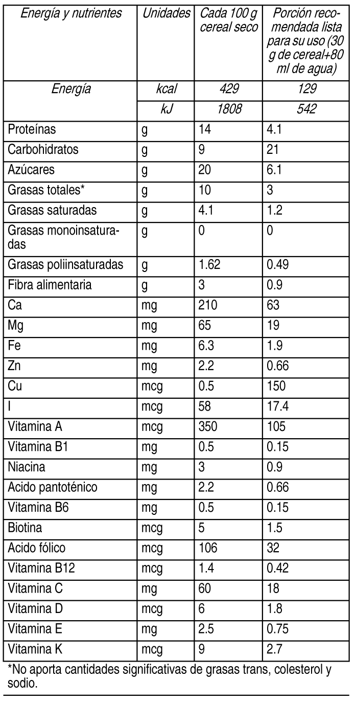 COMPOSICION: Ver Tabla Contiene: Harina de Arroz, Harina de Germen de Algarroba, Maltodextrina, Mezcla de Aceites Vegetales (Aceite de: Palma, Canola, Girasol, Coco, Oleína de Palma), Azúcar, Carbonato de Calcio, Emulsionante (INS 472c), Vitamina C, Niacina, Pantotenato, Vitamina E, Vitamina B1, Vitamina B6, Vitamina A, Ácido Fólico, Vitamina K, Vitamina D, Biotina, Vitamina B12, Difosfato Férrico, Sulfato de Zinc, L-Carnitina, Sulfato de Cobre, Yodato de Potasio.