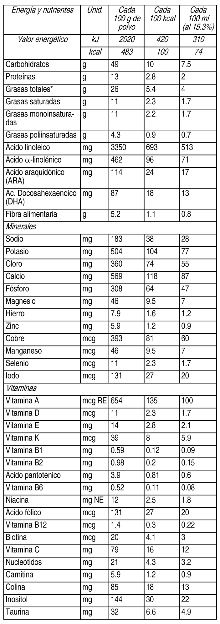 COMPOSICION: Ver Tabla Contiene: Lactosa, Aceites Vegetales (Aceites de: Girasol, Coco, Canola, Palma, Aceite de Prímula, Aceite de Células Simples), Leche Descremada, Concentrado de Proteína de Suero, Jarabe de Glucosa, Fibra Alimentaria (Galacto-Oligosacáridos, Fructo-Oligosacáridos), Triglicéridos de Cadena Media, Grasas Animales (Lípidos de Huevo, Aceite de Pescado), Carbonato de Calcio, Fosfato Tricálcico, Citrato Tripotásico, Cloruro de Sodio, Fosfato Hidrógeno Magnésico, Inositol, Ácido L-Ascórbico, Cloruro de Colina, Lecitina de Soja (E322), Taurina, Sulfato Ferroso, Acetato de DL-Alfa Tocoferol, Sulfato de Zinc, Nucleótidos (Citidina, Uridina, Inosina, Adenosina, Guanosina), Nicotinamida, D-Pantotenato de Calcio, L-Carnitina, Acetato de Retinol, Sulfato Cúprico, Palmitato de Retinol, DL-Alfa Tocoferol, Hidroclorhidrato de Tiamina, Hidroclorhidrato de Piridoxina, Colecalciferol, Cianocobalamina, Riboflavina, Ácido Fólico, Ioduro de Potasio, Sulfato de Manganeso, Fitomenadiona, Selenito de Sodio, D-Biotina. Contiene derivados de Leche, Soja, Huevo y Pescado.