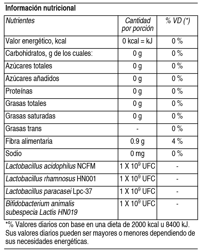 COMPOSICION: Contiene: Polidextrosa, Lactobacillus acidophilus NCFM, Lactobacillus rhamnosus HN001, Lactobacillus paracasei Lpc-37, Bifidobacterium animalis subsp. lactis HN019. Ver Tabla