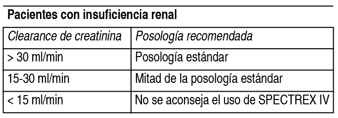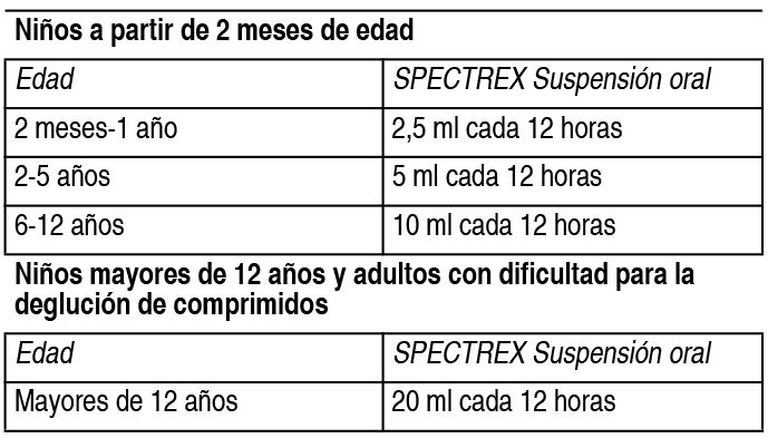 COMPOSICION: Suspensión Oral: Cada 5 ml contiene: Trimetoprima 40 mg; Sulfametoxazol 200 mg. Inyectable I.V.: Ampolla I.V. monodosis de 5 ml: Cada ampolla contiene: Trimetoprima 80 mg; Sulfametoxazol 400 mg. Frasco-ampolla I.V. de 5 ml: Cada frasco-ampolla contiene: Trimetoprima 80 mg; Sulfametoxazol 400 mg. Frasco-ampolla I.V. de 10 ml: Cada frasco-ampolla contiene: Trimetoprima 160 mg; Sulfametoxazol 800 mg. Frasco-ampolla I.V. Multidosis de 30 ml: Cada frasco-ampolla contiene: Trimetoprima 480 mg; Sulfametoxazol 2.400 mg. Ampolla I.M. de 3 ml: Cada ampolla contiene: Trimetoprima 160 mg; Sulfametoxazol 800 mg. Ampolla I.M. Forte de 4.5 ml: Cada ampolla contiene: Trimetoprima 240 mg; Sulfametoxazol 1.200 mg. Ampolla I.M. Pediátrico de 1.5 ml: Cada ampolla contiene: Trimetoprima 80 mg; Sulfametoxazol 400 mg. Comprimidos: Cada comprimido pediátrico contiene: Trimetoprima 20 mg; Sulfametoxazol 100 mg. Cada comprimido adulto contiene: Trimetoprima 80 mg; Sulfametoxazol 400 mg. Cada comprimido Forte contiene: Trimetoprima 160 mg; Sulfametoxazol 800 mg. ACCION: Agente quimioterápico, bactericida, antiinfeccioso de amplio espectro. INDICACIONES: Suspensión Oral: Infecciones del tracto urinario causadas por Escherichia coli, Klebsiella species, Enterobacter species, Morganella morganii, Proteus mirabilis y Proteus vulgaris. Otitis media aguda en niños debido a cepas susceptibles de Streptococcus pneumoniae o Haemophilus influenzae cuando a juicio médico Spectrex ofrezca alguna ventaja sobre el uso de otros agentes antimicrobianos. Hasta la fecha, son limitados los datos que avalen la seguridad de su uso en forma repetida en niños menores de 2 años. Spectrex no está indicado como tratamiento profiláctico o prolongado en los casos de otitis media. Exacerbación aguda de bronquitis crónica en adultos debido a Streptococcus pneumoniae o Haemophilus influenzae cuando a juicio del médico Spectrex posea ventajas sobre otros antimicrobianos. Shigellosis: para el tratamiento de la enteritis causada por cepas susceptibles de Shigella flexneri y Shigella sonnei cuando esté indicada una terapia antibacteriana. Neumonía - Pneumocystis carinii: para el tratamiento de neumonía - Pneumocystis carinii documentada. Como profilaxis en los casos de individuos inmunodeprimidos y aquéllos con mayor riesgo a desarrollar neumonía - Pneumocystis carinii. Diarrea del viajero en adultos: para el tratamiento de esta afección debido a cepas susceptibles de E. coli enterotóxicas. Inyectable: Neumonía por Pneumocystis carinii: tratamiento de la neumonía por Pneumocystis carinii en niños y adultos. Shigellosis: Tratamiento de enteritis causada por cepas susceptibles de Shigella flexneri y Shigella sonnei en niños y adultos. Infecciones del tracto urinario: tratamiento de las infecciones del tracto urinario severas o complicadas debido a cepas sensibles de Escherichia coli, especies de Klebsiella, especies de Enterobacter, Morganella morganii y especies de Proteus; también está indicado cuando la administración de Spectrex por vía oral no es posible y cuando el organismo no es sensible a la administración de un único agente antibacteriano efectivo en el tratamiento de la infección urinaria. Comprimidos: Tratamiento de infecciones causadas por microorganismos sensibles a la asociación trimetoprima + sulfametoxazol; por ejemplo: Bronquitis y exacerbaciones agudas de la bronquitis crónica en adultos. -Neumonía por Pneumocystis carinii. -Diarrea del viajero en adultos. -Infecciones bacterianas del tracto urinario. Otras infecciones bacterianas: osteomielitis, brucelosis, nocardiosis, micetomas (no fúngicos). Agente de elección tanto en la profilaxis de la infección por Pneumocystis carinii en pacientes con VIH /SIDA, como para la prevención de su recurrencia (terapia crónica de mantenimiento), asimismo puede ser eficaz en la prevención de la toxoplasmosis cerebral y de otras infecciones bacterianas en estos pacientes. DOSIS: Suspensión: La dosis se adaptará según criterio médico al cuadro clínico del paciente. Como posología media de orientación se aconseja: Cada 5 ml de suspensión contienen trimetoprima 40 mg + sulfametoxazol 200 mg. Niños a partir de 2 meses de edad. Ver Tabla La dosis habitual se calcula en base a sulfametoxazol/trimetoprima 30/6 mg/kg/día. A criterio médico, según el tipo y gravedad de la infección, incluido el Pneumocystis carinii como agente etiológico, se pueden administrar dosis superiores, generalmente hasta 100 mg/kg/día de sulfametoxazol y/o modificar los intervalos entre tomas, p. ej. 3 veces por día (cada 8 horas). Administrar la cantidad indicada por boca directamente medida con el vaso provisto, graduado en mililitros. Spectrex Suspensión Oral puede administrarse indistintamente antes, durante o después de ingerir alimentos, preferentemente con 1 vaso completo de agua o de otra bebida no alcohólica. Durante el tratamiento con sulfonamidas es aconsejable ingerir varios vasos adicionales de agua o de otra bebida no alcohólica a lo largo del día, a fin de evitar su depósito como cristales en la vía urinaria. Posología de orientación en situaciones especiales: Neumonía por Pneumocystis carinii: Tratamiento Spectrex Suspensión Oral, en dosis hasta 100 mg/kg de peso de sulfametoxazol en 24 horas, repartidos en 4 dosis iguales cada 6 horas, durante 14 días. Ver Tabla Neumonía a Pneumocystis carinii: Prevención niños a partir de los 2 meses de edad: Spectrex Suspensión Oral, en dosis de 750 mg/m2/día de sulfametoxazol por vía oral, repartidos en 2 tomas iguales por día, durante 3 días consecutivos por semana, sin superar los 1.600 mg diarios. Insuficiencia renal: Ver Tabla Inyectable: Vía de administración: Parenteral. La administración parenteral de Spectrex IV está indicada en los casos en que es imposible la administración oral, especialmente en infecciones pre y posoperatorias a organismos sensibles, tales como tifoidea y p