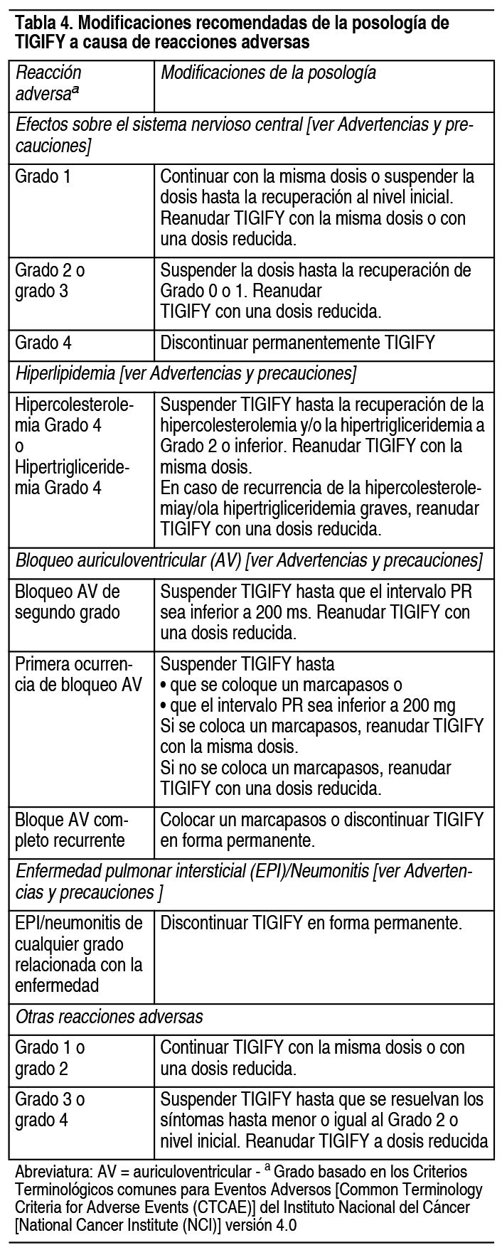 DOSIS: Dosis recomendada: La dosis recomendada de Tigify es de 100 mg por vía oral 1 vez al día, con o sin alimentos, hasta la progresión de la enfermedad o una toxicidad inaceptable. Los comprimidos se deben ingerir enteros. No se los debe masticar, triturar ni partir. No ingiera los comprimidos si están rotos, quebrados o, en definitiva, si no están intactos. Tome Tigify todos los días a la misma hora. Si olvida una dosis, tome la dosis que no tomó, a menos que deba tomar la siguiente dosis dentro de las 4 horas. No tome 2 dosis al mismo tiempo para compensar la dosis que no tomó. No tome una dosis adicional si vomita después de tomar Tigify pero continúe con la siguiente dosis programada. Modificaciones de la dosis a causa de reacciones adversas: Las reducciones de la dosis que se recomiendan son: Primera reducción de la dosis: Tigify 75 mg por vía oral 1 vez al día. Segunda reducción de la dosis: Tigify 50 mg por vía oral 1 vez al día. Tigify debe discontinuarse permanentemente en aquellos pacientes que no pueden tolerar la dosis de 50 mg por vía 1 vez al día. En la Tabla 4 se observan las modificaciones de la posología de Tigify a causa de reacciones adversas. Ver Tabla Uso concomitante de inductores fuertes o moderados de la subfamilia CYP3A: Tigify está contraindicado en pacientes que tomen inductores fuertes del CYP3A. Se deben discontinuar los inductores del CYP3A durante 3 semividas plasmáticas del inductor fuerte del CYP3A antes de iniciar el tratamiento con Tigify. Se debe evitar el uso concomitante de TIGIFY con inductores moderados del CYP3A. Modificación de la posología en caso de tratamiento con inhibidores fuertes del CYP3A: Se debe evitar el uso concomitante de Tigify con inhibidores fuertes del CYP3A. Si no se puede evitar el uso concomitante con un inhibidor fuerte del CYP3A, se debe reducir la dosis inicial de Tigify de 100 mg por vía oral 1 vez al día a 75 mg por vía oral 1 vez al día. A los pacientes a los que se les redujo la dosis a 75 mg por vía oral Tigify vez al día debido a las reacciones adversas y que comiencen un tratamiento con un inhibidor fuerte del CYP3A, se les debe reducir la dosis de Tigify a 50 mg por vía oral 1 vez al día. Si se suspende el uso concomitante el inhibidor fuerte del CYP3A, se debe aumentar la dosis de Tigify (después de 3 semividas plasmáticas del inhibidor fuerte del CYP3A) a la dosis que se tomaba antes de inicia el inhibidor fuerte.
