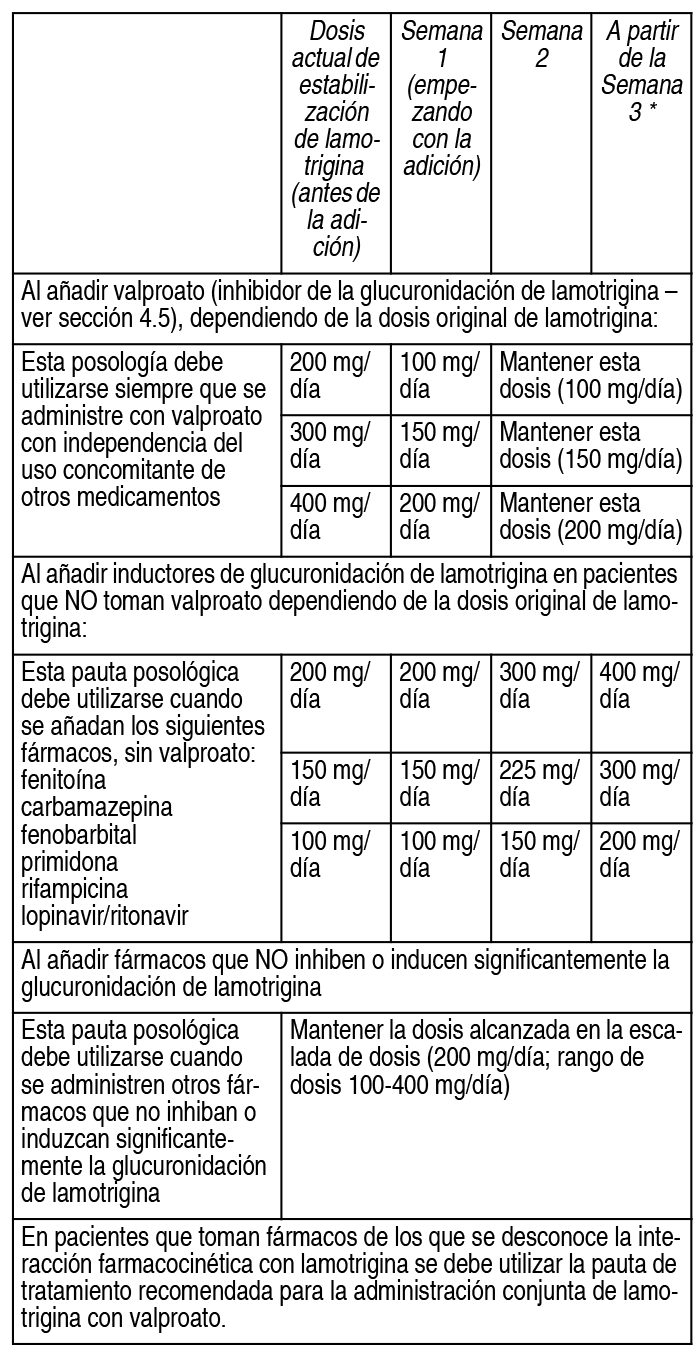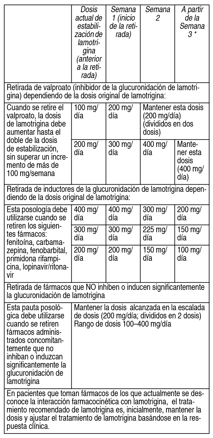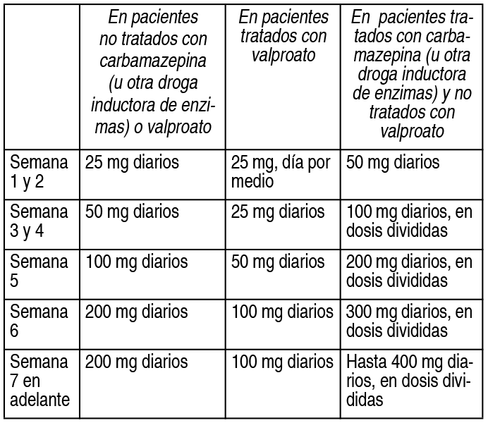 COMPOSICION: Latrigin 25: cada comprimido dispersable ranurado contiene: Lamotrigina 25 mg. Latrigin 50: cada comprimido dispersable ranurado contiene: Lamotrigina 50 mg. Latrigin 100: cada comprimido dispersable ranurado contiene: Lamotrigina 100 mg. Latrigin 200: cada comprimido dispersable ranurado contiene: Lamotrigina 200 mg. ACCION: Antiepiléptico. INDICACIONES: Epilepsia: Adultos y adolescentes mayores de 12 años: Tratamiento complementario o en monoterapia de crisis focales y crisis generalizadas, incluyendo crisis tónico-clónicas. Crisis asociadas al síndrome de Lennox-Gastaut: como tratamiento complementario o como DAE de inicio. Niños y adolescentes entre 2 y 12 años: Tratamiento complementario de crisis focales y crisis generalizadas, incluyendo crisis tónico-clónicas y crisis asociadas al síndrome de Lennox-Gastaut. Monoterapia de crisis de ausencia típica. Trastorno bipolar: tratamiento de mantenimiento del trastorno bipolar I para retrasar la aparición de episodios afectivos (depresión, manía, hipomanía, episodios mixtos) en pacientes tratados por episodios afectivos agudos con la terapia estándar. No se recomienda el uso de lamotrigina para el tratamiento de la manía aguda, episodio depresivo de tipo bipolar o en los episodios mixtos. La eficacia de lamotrigina en el tratamiento agudo de los episodios afectivos no ha sido establecida. DOSIS: Esquema posológico recomendado: Recomendaciones posológicas en adultos y niños mayores de 12 años: En monoterapia: Semana 1 a 2: 25 mg/día en 1 toma. Semana 3 a 4: 50 mg/día en 1 toma. Posología de mantenimiento: 100 a 200 mg/día en 1 ó 2 tomas diarias. Esta dosis de mantenimiento se alcanza con incrementos de 50 a 100 mg como máximo cada 1 a 2 semanas. En algunos pacientes pueden ser necesarias dosis de hasta 50 mg/día para obtener la respuesta deseada. En asociación con inductores de la glucuronidación (fenitoína, carbamazepina, fenobarbital, primidona, rifampicina, lopinavir/ritonavir) en pacientes que no toman valproato de sodio). Semana 1 y 2: 50 mg/día en 1 toma. Semana 3 y 4: 100 mg/día en 2 tomas. Posología de mantenimiento: 200 a 400 mg/día en 2 tomas. Esta dosis de mantenimiento se alcanza con incrementos de 100 mg como máximo cada 1 a 2 semanas. En asociación con fármacos que no son inductores de la glucuronidación ni con valproato de sodio*: Semana 1 y 2: 25 mg día por medio en 1 toma. Semana 3 y 4: 50 mg/día en 1 toma. Posología de mantenimiento: 100 a 200 mg/día en 1 ó 2 tomas. Esta dosis de mantenimiento se alcanza con incrementos de 25 a 50 mg como máximo cada 1 a 2 semanas. Terapia de adición o coadyuvante: Con valproato de sodio: Semana 1 y 2: 25 mg administrado día por medio, en 1 toma. Semana 3 y 4: 25 mg/día en 1 toma. Posología de mantenimiento: 100 a 200 mg/día en 1 ó 2 tomas diarias. Esta dosis de mantenimiento se alcanza con incrementos de 25 a 50 mg como máximo cada 1 a 2 semanas. * Esta recomendación posológica debe utilizarse con otros medicamentos que no inhiban o induzcan la glucuronidación de lamotrigina de manera significativa. Recomendaciones posológicas en niños de 2 a 12 años: Monoterapia en crisis de ausencia típica: Semana 1 y 2: 0.3 mg/kg/día (1 vez al día o divididos en 2 dosis). Semana 3 y 4: 0.6 mg/kg/día (1 vez al día o divididos en 2 dosis). Posología de mantenimiento: 1-15 mg/kg/día (1 vez al día o divididos en 2 dosis). Para alcanzar las dosis de mantenimiento, las dosis pueden aumentarse en un máximo de 0.6 mg/kg/día cada 1 ó 2 semanas hasta alcanzar la respuesta óptima, con una dosis de mantenimiento máxima de 200 mg/día. Terapia de adición o coadyuvante: con valproato de sodio: Semana 1 y 2: 0.15 mg/kg/día en 1 ó 2 tomas. Semana 3 y 4: 0.30 mg/kg/día en 1 ó 2 tomas. Posología de mantenimiento: 1 a 5 mg/kg/día en 1 ó 2 tomas sin sobrepasar los 200 mg/día. Esta dosis de mantenimiento se alcanza con incrementos de 0.3 mg/kg como máximo cada 1 a 2 semanas. En asociación con inductores de la glucuronidación (fenitoína, carbamazepina, fenobarbital, primidona, rifampicina, lopinavir/ritonavir) en pacientes que no toman valproato de sodio: Semana 1 y 2: 0.6 mg/kg/día repartidos en 2 tomas. Semana 3 y 4: 1.2 mg/kg/día repartidos en 2 tomas. Posología de mantenimiento: 5 a 15 mg/kg/día en 2 administraciones. Dosis máxima: 400 mg/día en 2 tomas. Esta dosis de mantenimiento se alcanza con incrementos de 1.2 mg/kg como máximo cada 1 a 2 semanas. En asociación con fármacos que no son inductores de la glucuronidación ni con valproato de sodio*: Semana 1 y 2: 0.3 mg/kg/día en 1 vez al día o divididos en 2 dosis. Semana 3 y 4: 0.6 mg/kg/día 1 vez al día o divididos en 2 dosis. Posología de manenimiento: 1 a10 mg/kg/día en 1 ó 2 dosis sin sobrepasar los 200 mg/día. Esta dosis de mantenimiento se alcanza con incrementos de 0.6 mg/kg como máximo cada 1 a 2 semanas. * Esta recomendación posológica debe utilizarse con otros medicamentos que no inhiban o induzcan la glucuronidación de lamotrigina de manera significativa. En todos los casos la dosis inicial recomendada no deberá excederse y deberá respetarse el aumento progresivo de las dosis, debido al riesgo de erupción cutánea. Puede tomar varias semanas o meses conseguir una dosis de mantenimiento individualizada. Puede ser necesario aumentar hasta en un 50%, las dosis de mantenimiento en pacientes con un peso inferior a 30 kg con base en la respuesta clínica, independientemente de su edad o el DAE concomitante. Se debe controlar el peso del niño para asegurar que se mantiene la dosis terapéutica y en caso de que se produzcan cambios en el peso del paciente, la dosis debe ajustarse. Es probable que los pacientes entre 2 y 6 años requieran una dosis de mantenimiento en el límite superior de la recomendada. Niños menores de 2 años: No se dispone de información suficiente sobre la eficacia y la seguridad de lamotrigina como terapia complementa