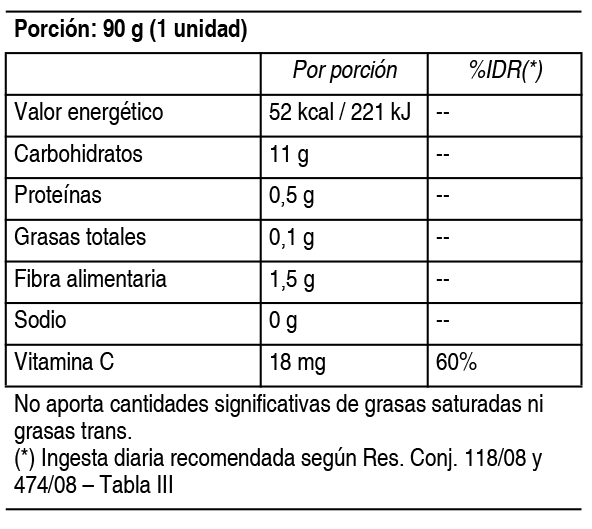 COMPOSICION: Información nutricional: Manzana y Banana. Ver Tabla Contiene: Manzana, Pera, Banana, Damasco, Acido Ascórbico. ACCION: Preparado a base de puré de manzana, pera, banana y damasco para lactantes a partir del 6° mes. Libre de gluten. SIN T.A.C.C. PRESENTACIONES: Pouch conteniendo 90 g. |
