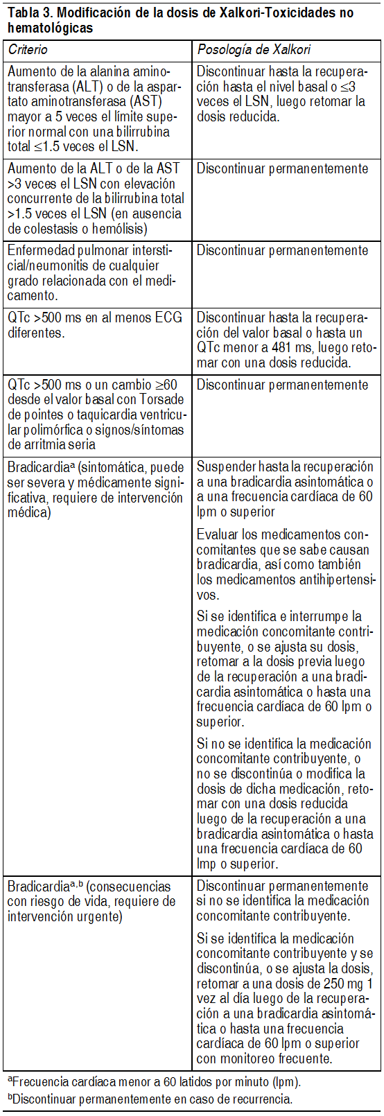 DOSIS: Posología recomendada: La dosis recomendada de Xalkori es de 250 mg por vía oral, 2 veces al día hasta la progresión de la enfermedad o hasta que el paciente no lo tolere. La dosis de Xalkori recomendada en pacientes con deterioro renal severo (depuración de creatinina <30 ml/min) que no requieren diálisis es de 250 mg vía oral, una vez al día. Xalkori puede administrarse con o sin alimentos. Las cápsulas deben ingerirse enteras. En caso de omisión de una dosis de Xalkori, compense dicha dosis, salvo que resten menos de 6 horas hasta la dosis siguiente. Si se producen vómitos luego de la ingesta de una dosis de Xalkori, tome la próxima dosis a la hora habitual. Modificación de la dosis: Reduzca la dosis como se indica a continuación, si se requiere la reducción de 1 o más dosis debido a las reacciones adversas de severidad grado 3 ó 4, según se define por los Criterios de Terminología Común para los Eventos Adversos del Instituto Nacional del Cáncer (CTCAE) versión 4.0: Primera reducción de dosis: Xalkori 200 mg, vía oral, 2 veces al día. Segunda reducción de dosis: Xalkori 250 mg, vía oral, 1 vez al día. Interrumpa en forma permanente si no puede tolerar Xalkori 250 mg 1 vez al día. En las tablas 2 y 3, se proporcionan pautas para la reducción de la dosis: Tabla 2: Modificación de la dosis de Xalkori®-Toxicidades hematológicasa:Grado de CTCAE: Posología de Xalkori: Grado 3: Discontinuar hasta la recuperación hasta un grado 2 o menor, luego retomar con la misma posología. Grado 4: Discontinuar hasta la recuperación hasta un grado 2 o menor, luego retomar con la dosis menor siguiente. aSalvo linfopenia (a menos que esté relacionada con eventos clínicos, p. ej. infecciones oportunistas). Ver Tabla Una vez al mes, deben realizarse hemogramas completos que incluyan un recuento diferencial de leucocitos según la indicación clínica, con un aumento de la frecuencia de repetición de análisis en caso de observarse anomalías de grado 3 ó 4, o en caso de fiebre o infección.
